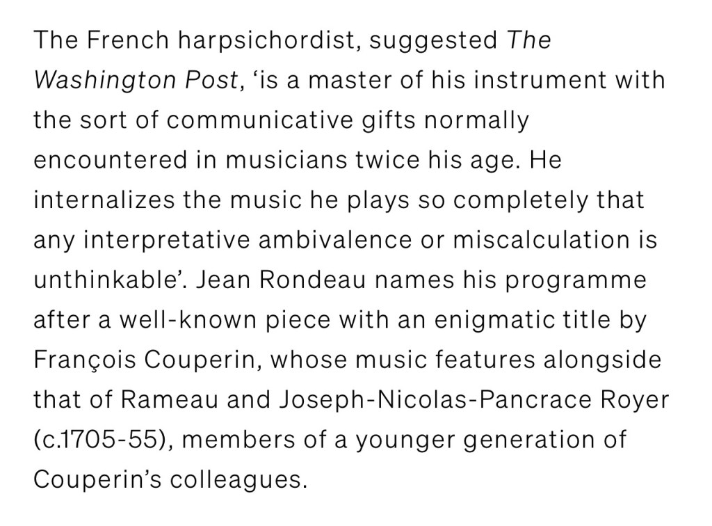 “We should think about the example Couperin’s harpsichord works set us: they are marvelous models of grace and innocence long past. Nothing could ever make us forget the subtly voluptuous perfume, so delicately perverse, that so innocently hovers over the Barricades Mystérieuses.”