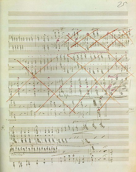 Page 25 of the manuscript. The large section crossed out in red contains the original loud ending