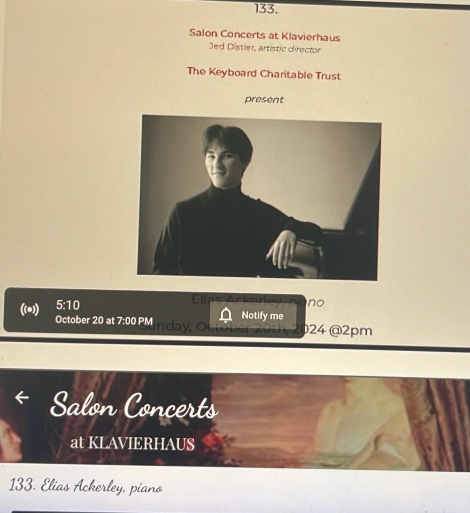 The atmosphere felt like a nice salon kind of vibe! I particularly liked the piano – it had such a warm sound to it – perfect for the Schumann and it cushioned the potentially harsh sounds that can arise from the Liszt too! It overall went well! I was able to talk to a few people and have dinner with Gloria and her husband. It was such a wonderful time. I would love to return to both Castelton and DC 😂) – Elias