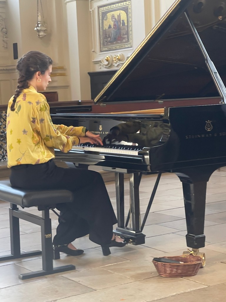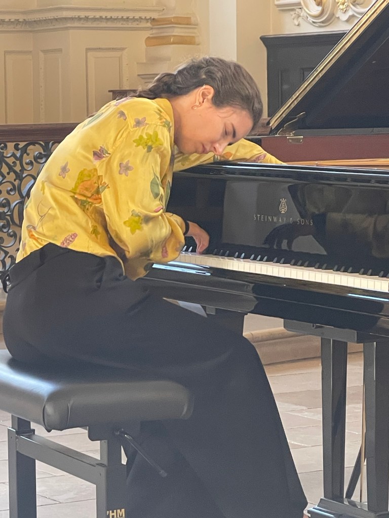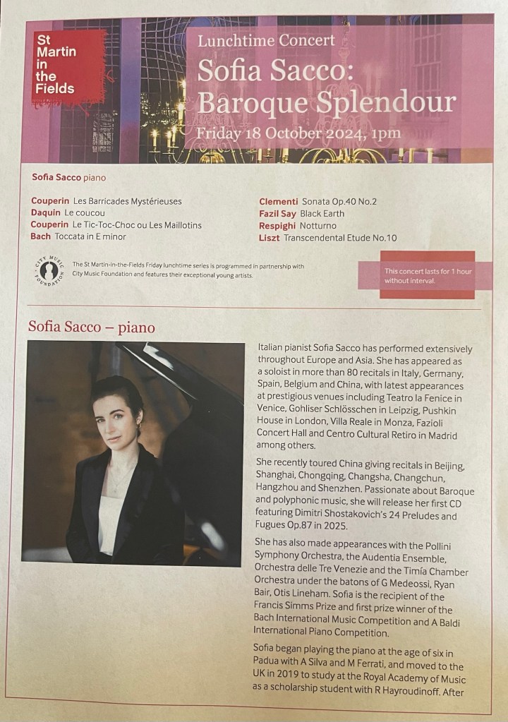 Italian pianist Sofia Sacco has performed extensively throughout Europe and Asia. She appeared as soloist in more than 80 recitals in Italy, Germany, Spain, Belgium, and China with latest appearances at prestigious venues including Teatro la Fenice in Venice, Gohliser Schlösschen in Leipzig, Pushkin House in London, Villa Reale in Monza, Fazioli Concert Hall and Centro Cultural Retiro in Madrid among others.She recently toured China giving recitals in Beijing, Shanghai, Chongqing, Changsha, Changchun, Hangzhou and Shenzhen. Passionate about Baroque and polyphonic music, she will release her first CD featuring Dimitri Shostakovich’s 24 Preludes and Fugues Op.87 in 2025.She has also made appearances with the Pollini Symphony Orchestra, the Audentia Ensemble, Orchestra delle Tre Venezie and the Timía Chamber Orchestra under the batons of G. Medeossi, Ryan Bair, Otis Lineham. Sofia is the recipient of the Francis Simms Prize and first prize winner of the Bach International Music Competition and A. Baldi International Piano Competition.Sofia began playing the piano at the age of 6 in Padua with A. Silva and M. Ferrati, and moved to the UK in 2019 to study at the Royal Academy of Music as a scholarship student with R. Hayroudinoff. After completing her Master of Arts and Professional Diploma, Sofia was appointed Hodgson Fellow of the Royal Academy of Music for two consecutive years, and has recently been awarded the Aud Jebsen Fellowship for 2024/2025.Inquisitive and widely curious, she is also a Physics graduate from the University of Padua. Alongside her performing career, Sofia is an enthusiastic teacher, and she currently holds a teaching position at Trinity Music School and Queen’s College in London as well as teaching at the Royal Academy of Music as part of her fellowship.