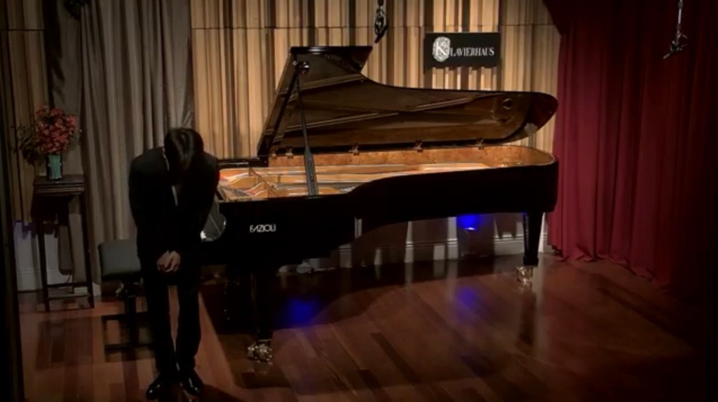 And it is on Fou Ts”ong’s magnificent Steinway D that Misha Kaploukhii kept us enraptured with playing of astonishing assurance , technical mastery and poetic sensitivity. It was in Messian ,though , that one could feel the presence of Ts’ong as this young man played the pungent heart rending dissonances with a kaleidoscope of colours.This was a kiss blessed by the Gods as the disarming simplicity of the opening was elaborated with sounds that I doubt have been heard on this piano since the most eclectic of poetic masters left us during the Covid epidemic.
