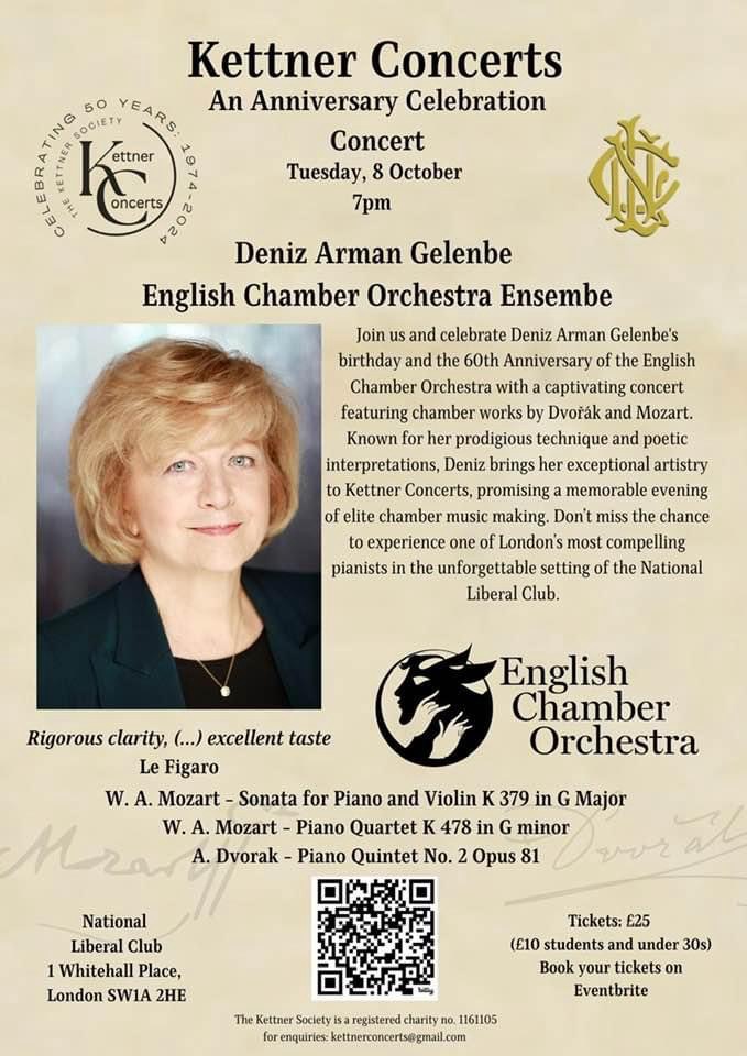 Happy Birthday Deniz Arman Gelenbe. Say it with music takes on a different significance when a very special occasion is treated to such sumptuous music making. The simple unadorned beauty of Mozart contrasted with the dynamic drive of Dvorak. Surrounded by friends and admirers what better way could there be to celebrate for a much loved musician of such stature. With illustrious colleagues from the English Chamber Orchestra this beautiful Lloyd George Hall in the National Liberal Club resounded with music making of refined elegance in Mozart and Dvorak’s sumptuous homage to his native Bohemia.