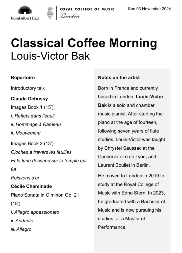 However Louis-Victor Bak filled the Elgar Room with an audience only too pleased to get up at dawn to hear such ravishing playing washed down with a much needed coffee and croissants.