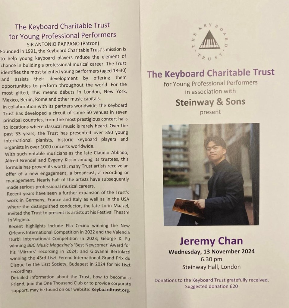 ‘The London Steinway Hall was buzzing with anticipation! The audience for this sold out concert included celebrated musicians, concert organisers and critics, taking the temperature up a notch for the evening’s performer- Jeremy Chan.