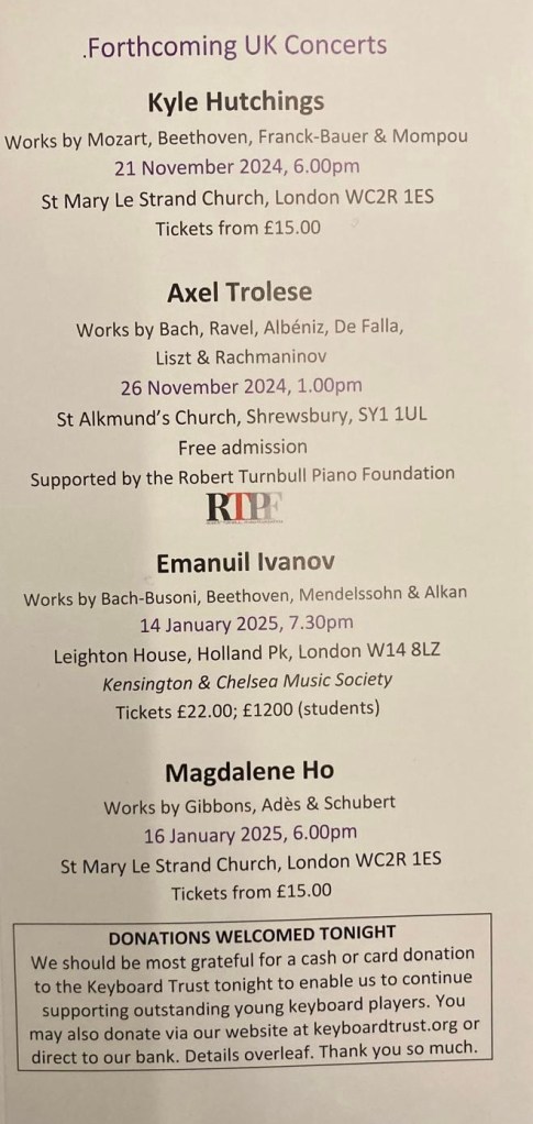 An audience that included two of the KT artistic directors (the third is at Steinways in Milan to present Misha Kaploukhii to the Italian public ) who were happy to interrogate and converse with this young musician who I had heard just a month ago with the same programme: