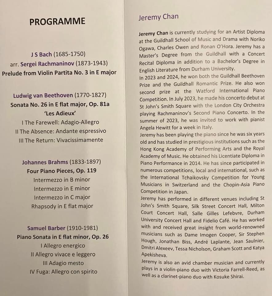 Jeremy Chan at Steinway Hall London for the Keyboard Trust where his eclectic programme of the four Bs made for a box office success: Bach,Beethoven Brahms and Barber!