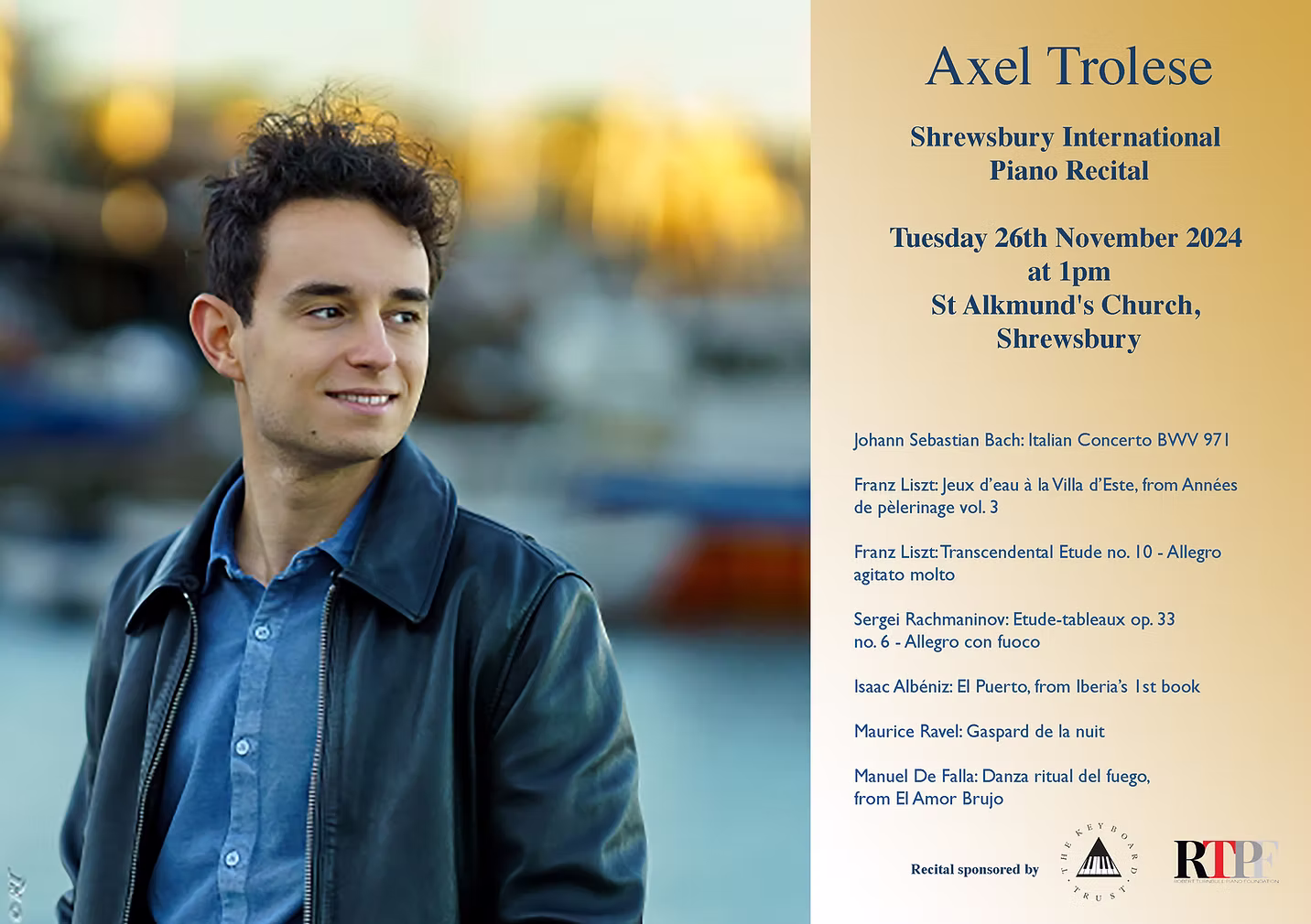 The Italian pianist Axel Trolese visited Shrewsbury on Tuesday 26th November 2024 to perform for the first time in Shropshire, arriving hot-foot from playing his debut recital in London at the new Bechstein Hall. This recital in the Tuesday lunchtime St Alkmund series was the first recital sponsored by The Keyboard Trust and the Robert Turnbull Piano Foundation, who plan to support two Shrewsbury International Piano Recitals per year, in recognition of the welcome given to young international pianists by the town. Axel comes highly recommended from his homeland, where he is a regular recitalist and esteemed teacher. His programme was influenced by his recent achievement of reaching the second round of the Ferruccio Busoni International Piano Competition. Axel explained to the audience that his programme demonstrated how the piano has been used to illustrate different genres of music. He started with J.S. Bach’s Italian Concerto, with the piano acting in orchestral fashion. As the first movement got underway, it was obvious that we were listening to a master of his craft, with immaculate technique, light pedalling and melodies singing from both hands. Repeats were adorned with intricate and subtle ornaments and variations in dynamics that seemed effortless and added to the freshness of his interpretation. The slow movement was achingly beautiful, played in a manner faithful to the period yet full of colour and interest. No surprise, then, to learn that Axel is a keen student of period instruments such as the fortepiano and harpsicord. The final movement was played with infectious enthusiasm, full of joy. What future pleasures await us as Axel delves into the vast treasure trove of Bach’s music for keyboard!Next up, from the baroque we moved to the watery depths of romantic repertoire of Franz Lizst, exploring the beautiful fountains and gardens of the 16th Century Villa D’Este in Tivoli near Rome. There were handfuls of notes pouring out of the piano in cascades of sound, soaking the audience in torrents of notes. Those of us lucky enough to have visited the Villa were reminded of the sculptural beauty of the gardens and fountains, which Liszt visited on three occasions. Axel then switched from the heavenly to the demonic Transcendental study in F minor which he played with seemingly effortless bravado.In my limited experience, it is rare to find a young pianist equally at home with Bach and Rachmaninov but it was the breadth and complexity of Axel’s repertoire that was so impressive in his recital. With technical challenges seemingly brushed aside, he could concentrate on the essence of the music, taking the audience with him on an exhilarating adventure. Rachmaninov Etude-Tableau? No problem.Axel has a deep love of French and Spanish music. He has recorded the complete Iberia by Albeniz and he played a composition based on the life of a busy fishing port, busy with sounds of a fish market and a young girl singing. Why an Italian feels so grounded in the dance and passion of Spanish music is a mystery, but Axel relishes their music and passion.St Alkmunds was not only full of an enthusiastic audience but characteristically bathed in winter sunshine. It was something of a jump of faith to get into the mood of the gothic world of sinking mermaids, hangmen and the night terrors of Ravel’s Gaspard de la Nuit. Ravel is Axel’s favourite composer and he relished disappearing into this spooky sound world, full of foreboding. Finally the recital ended with the flourish of De Falla’s Ritual Fire Dance, played with customary panache and passion. The Shrewsbury audience was on its feet, having enjoyed a world-class performer at the top of his game. The audience has no intention of letting Axel go without an encore and we heard the hauntingly beautifulCanción y danza no 6 by Federico Mompou. The simple beauty of the piece was a perfect end to an outstanding performance from a musician bound for greatness. Thank you Keyboard Trust and Robert Turnbull Piano Foundation for sending such a treasure for Shrewsbury to enjoy.