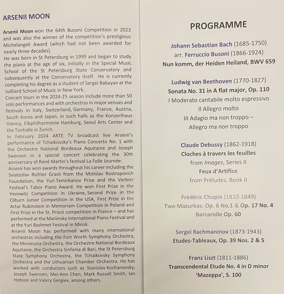 Pip Rolfe, Music Director at the Erin Arts Centre on the Isle of Man writes: ‘A huge thank you to Nikita Lukinov for an incredible recital on Saturday evening, plus a fascinating masterclass in the morning which introduced the audience to his programme and particularly to his favourite composer Mussorgsky. We’re glad the weather finally let you get home!’