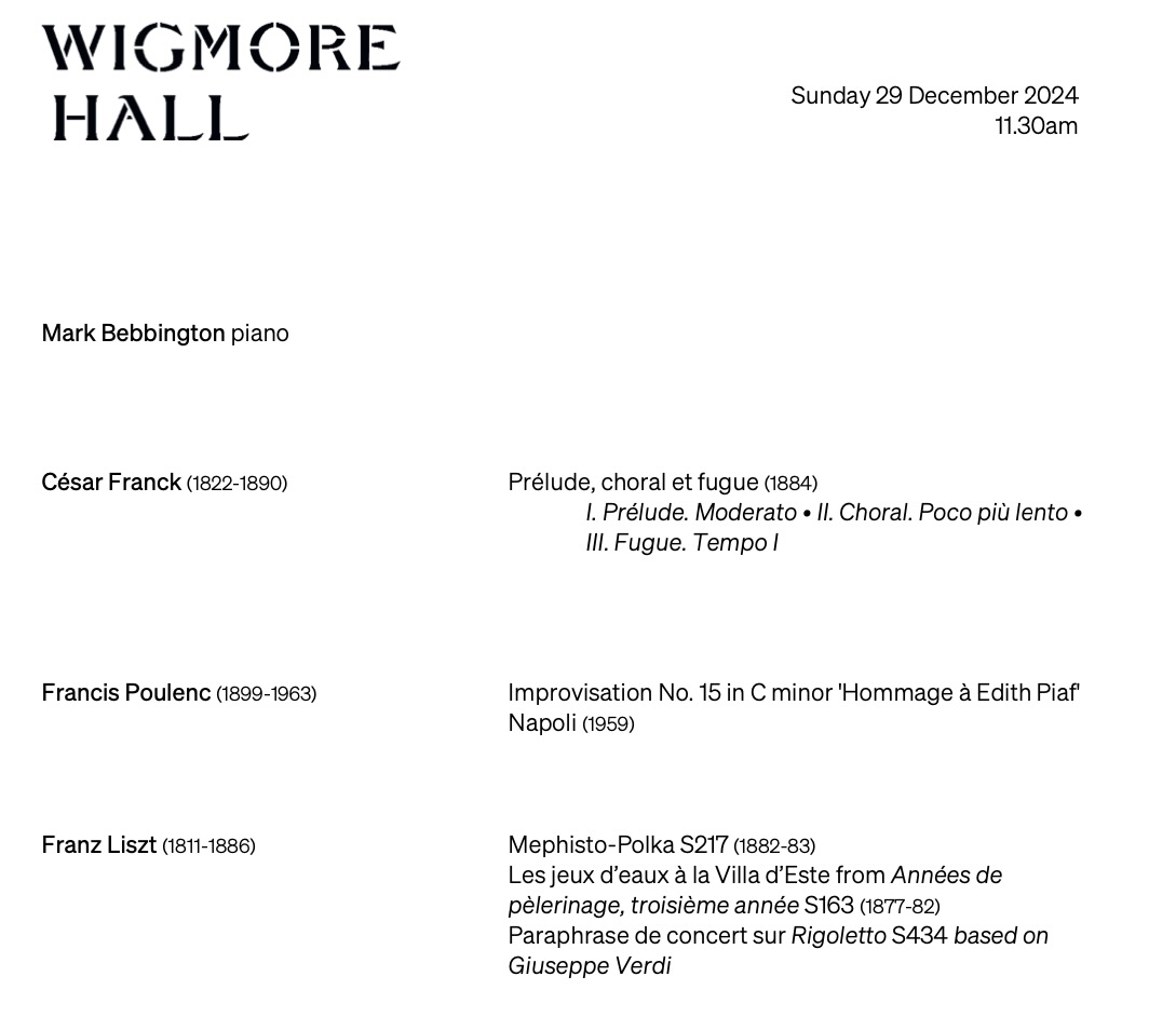 Mark Bebbington at the Wigmore Hall with a Hommage a Piaf that fast turned into the scintillating unmistakably French circus of Napoli , Poulenc Style.Mephisto Polka the last piece that Liszt was to pen with his energy obviously on the wane after admiring the scintillating fountains of the Villa d’Este or his transcendental paraphrase of Rigoletto all played with loving musicianship and daring.MB’s musicianship shone through all he played and nowhere more than in Cesar Franck’s much loved Prelude Chorale and Fugue