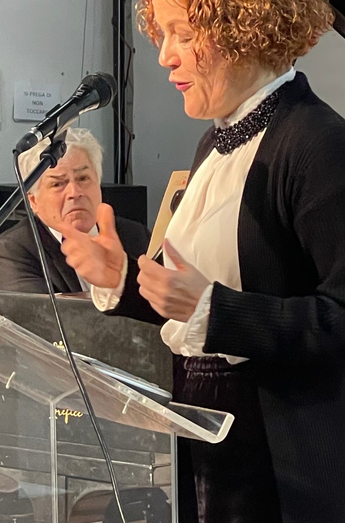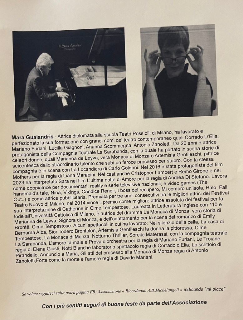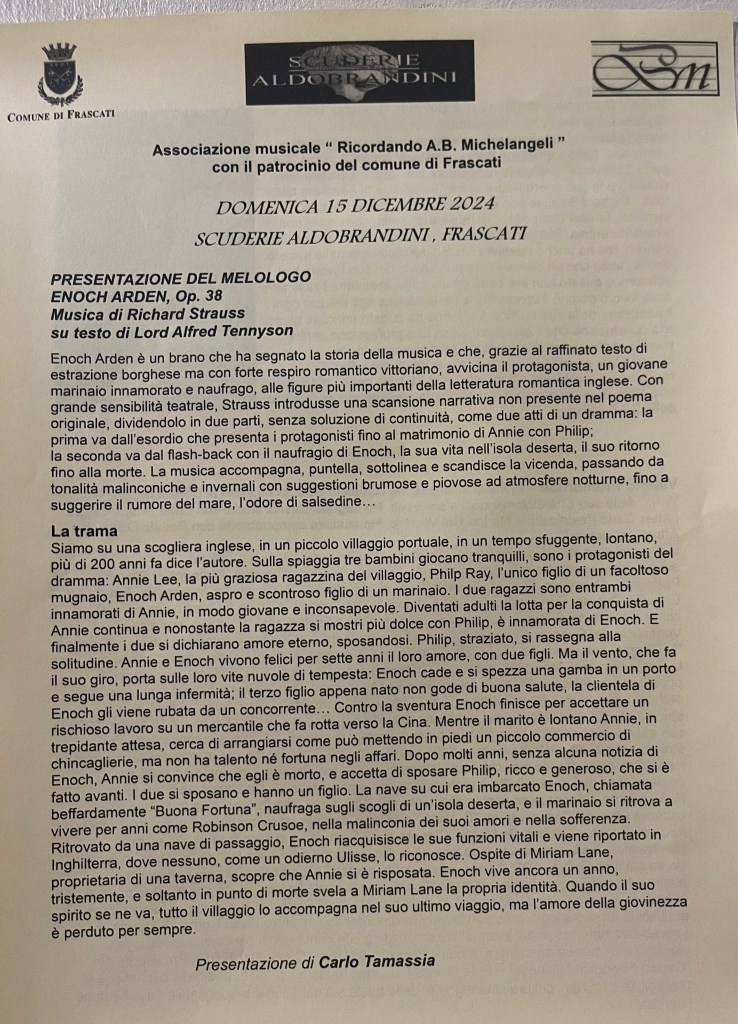 A road accident has left him semi invalid but it certainly did not stop him from playing the very difficult piano part with mastery and poetic understanding. Still able to pedal but only with the left foot he was able to create marvels of kaleidoscopic sounds following very closely the story that was unfolding as Mara told the harrowing story of Enoch and Annie.I have had the privilege to play this work with my late wife,Ileana Ghione, all over Italy and could appreciate the hold this work has on audiences of all ages. I remember a young girl being comforted by my wife after a performance we had given in Lucca. Bruno Cagli had translated the text into Italian as only a superb musician could possibly hope to do. We only made one addition to his version and that was to make sure that the last words that were uttered were indeed Enoch Arden. Bruno was thrilled with this addition that made a very moving close to this ,the most successful of melologues or musical declamations.After my wife’s death Milena Vukotic performed the work in many cities in celebration of the only actress that has ever opened and managed her own theatre for over thirty years.Mara Gualandris recited this. moving tale with clarity and simplicity allowing the harrowing tale to unwind without any rhetorical exaggerations.Valerio too listening so carefully and adding music where words were just not enough.