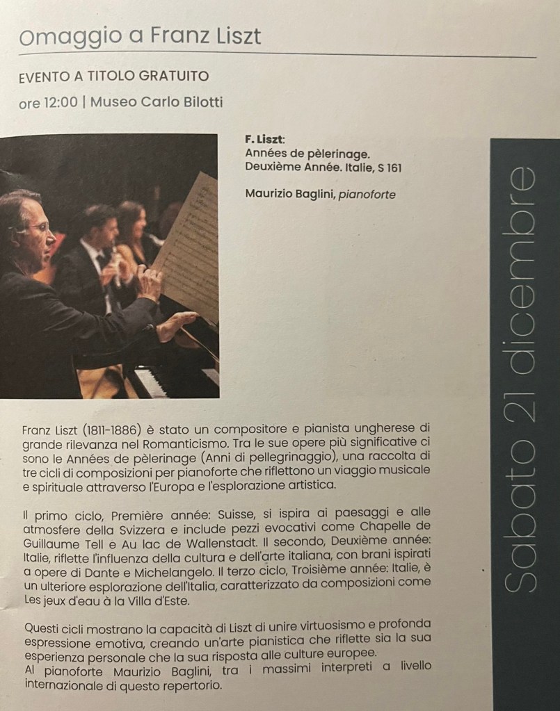 Années de pèlerinage (S.160,161,162,163) is a set of three suites for solo piano by Franz Liszt. Much of it derives from his earlier work, Album d’un voyageur, his first major published piano cycle, which was composed between 1835 and 1838 and published in 1842. Années de pèlerinage is widely considered as the masterwork and summation of Liszt’s musical style.Surrounded by beauty with an inspired and inspiring recital by Maurizio Baglini in the Bilotti museum in the sumptuous park of Villa Borghese.