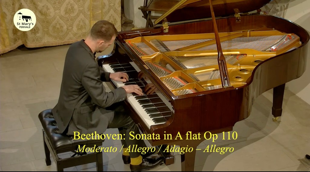 Some very fine musicianly playing of clarity and authority. Beethoven’s penultimate sonata was played with great architectural shape and a simplicity that allowed the music to seemingly speak for itself. A pastoral serenity to the first movement of sublime simplicity with a glowing fluidity. An Allegro scherzo of exemplary legato that made the treacherous trio a continuous stream of mellifluous sounds where technical difficulties were absorbed so naturally into an architectural shape of mellifluous forward movement .Dissolving to a whisper as the ‘Adagio’ was intoned with religious intensity.The pulsating left hand like a heartbeat on which Beethoven floats an aria of celestial beauty.The fugue that evolved with the same serenity as the aria returned with ever more glowing beauty. A whispered return of the fugue delicately inverted as it reached for the heights with the passionate conviction of a composer tired of the struggles he had suffered and is ready to exult and embrace his future.