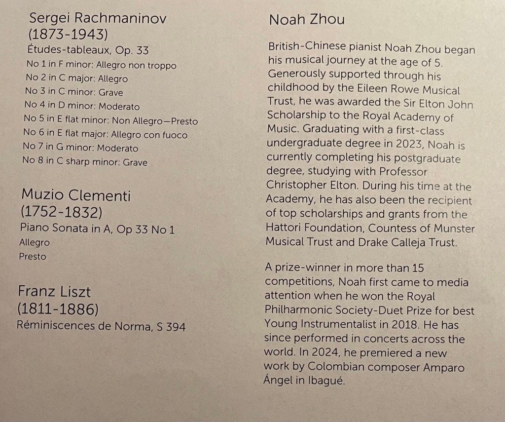 The young British-Chinese pianist Noah Zhou, currently a Master’s student at the Royal Academy of Music, is the recipient of many awards including the Young Pianist Foundation European Grand Prix, Horowitz International Competition, Drake Calleja Trust and the Hattori Foundation. A first prize winner at competitions in Rio and Valsesia in Italy, recent concerto performances include appearances in the Netherlands, Ukraine and Brazil. Noah’s virtuosic lunchtime recital ranges from Rachmaninov’s magnificent Etudes-tableaux to the elegance of Clementi and Liszt’s stormy imagination – a literature of dark and turbulent ecstasy.