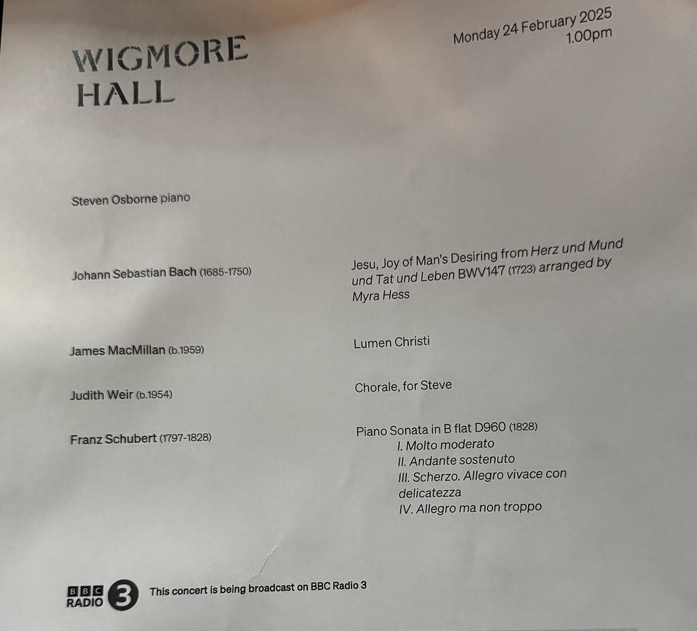 A remarkable recital for the BBC lunchtime series. Steven Osborne was able to seduce a full hall from the very first notes, drawing in the audience to share with him the discovery of whispered glowing sounds rather than projecting the performance out to them.