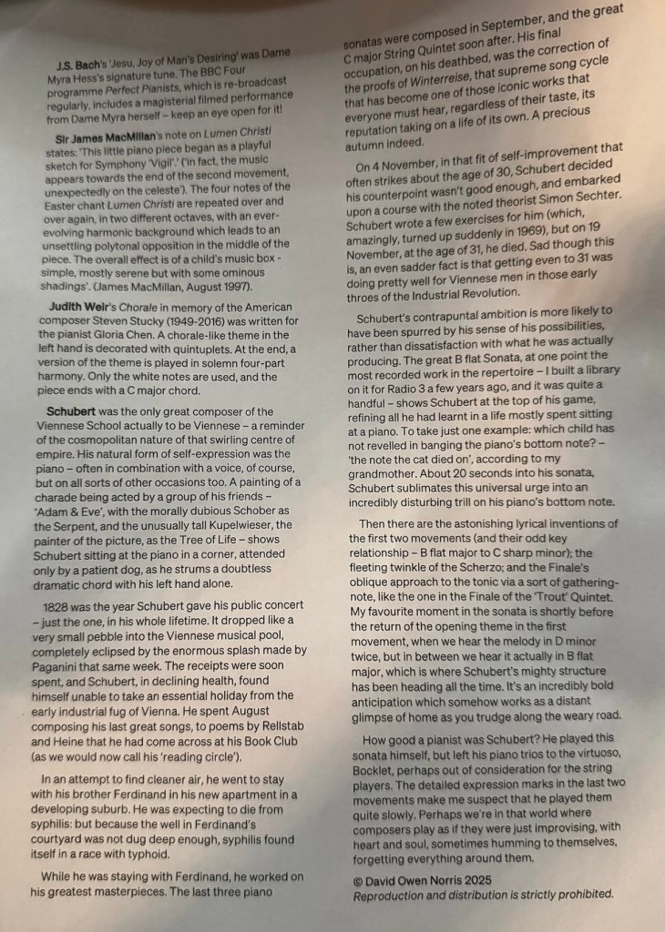Opening with the Myra Hess transcription of ‘Jesu Joy of Man’s Desiring ‘ and immediately establishing a luminosity of sound and an intimate world of subtlety and beauty. A flowing tempo allowed Bach’s glorious chorale to rise above the continuous accompanying flow of notes with respectful but also seductive beauty.There was a sense of balance that added a timeless beauty to every strand that sang with the fervant conviction of a true believer. A coda of magical bell like sounds interrupted only to make way for the music box folk song simplicity of MacMillan’s ‘Lumen Christi’. Judith Weir’s ‘Chorale for Steve’ was an alluring chattering of questioning sounds and answered by a chorale of poignant simplicity with a beguiling Scottish accent. The scene and the atmosphere was set for one of the most miraculous works ever written for the piano. Could Schubert have known that he had only a few months left on this earth? For this is truly a ‘Song of the Earth’ reaching out as Beethoven was to do in his last Sonatas to share with us their vision of Paradise. It was a pity to have to break the atmosphere that had been created, but the BBC obviously had to leave time for Fiona Talkington to present the sonata to the listeners, like me, at home.