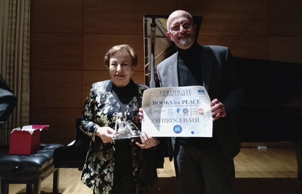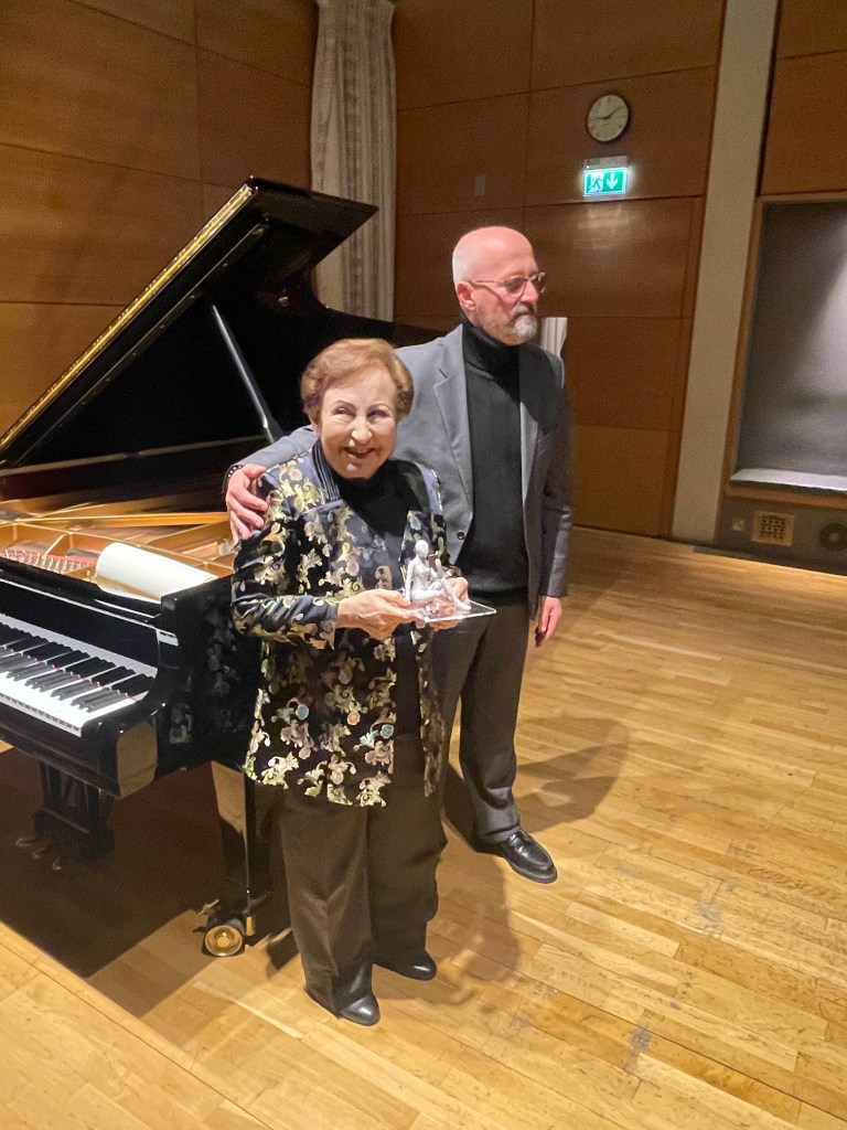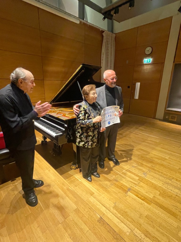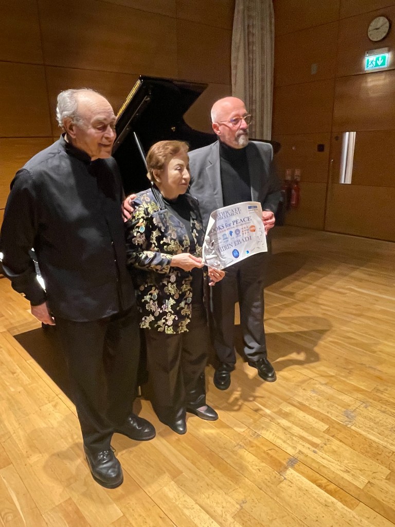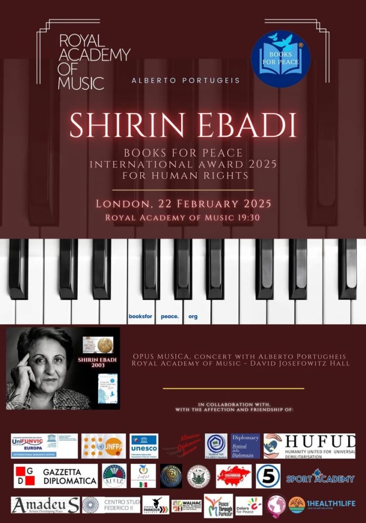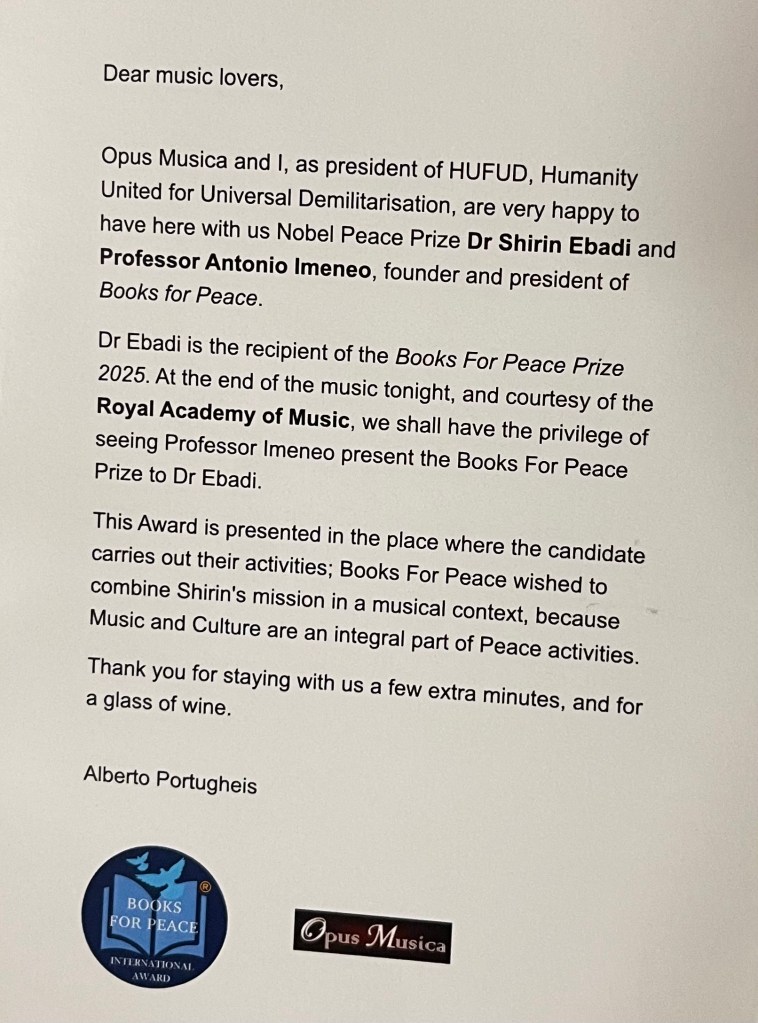 Chopin ‘s shortest Prelude was a peaceful introduction to the Nobel Peace Prize winner Dr Shirin Ebadi who had come to the Royal Academy not only to enjoy Alberto’s concert but also to receive from Professor Antonio Imeneo’s hands the ‘Books for Peace Prize’ for her heroic, tireless work for women’s rights.