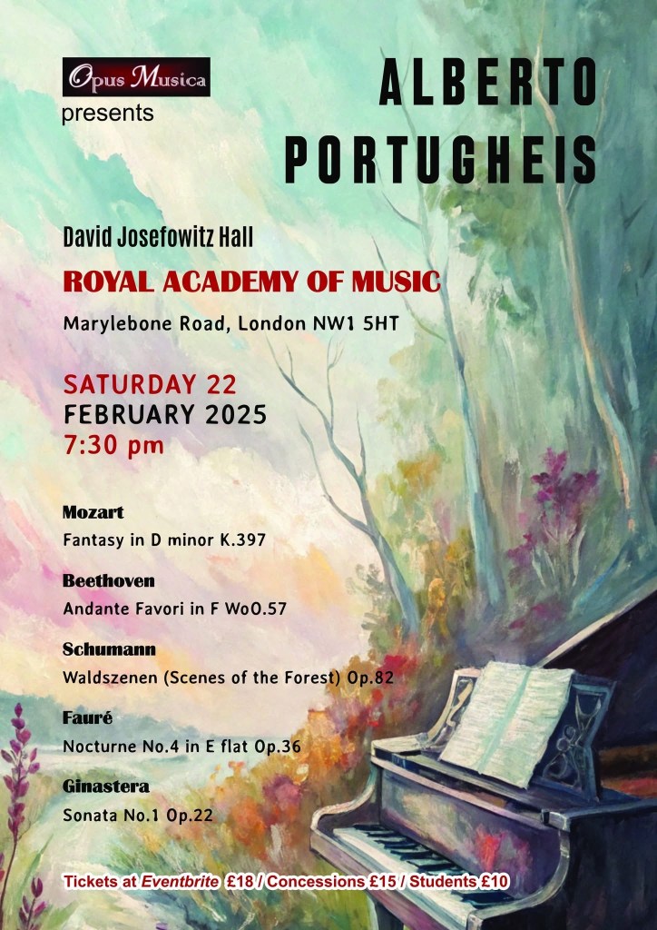 There is an element of nostalgia and a feeling of looking back with reminiscences of the youthful impact the beauty and magic of the forest could hold. It was this that shone through Alberto’s performance today. From the whimsical sense of improvisation ‘Jäger auf der Lauer’ (Hunters on the Lookout) with its cheeky ending finishing in a puff of smoke. A beautifully etched ‘Einsame Blumen’ (Lonely Flowers) , where the loneliness of these few lost blooms were depicted with a knowing weight of a lifetime at the keyboard. Projection and communication were one of the most significant features of Alberto’s playing. Not afraid of his emotions as he delved deep into each of these picture postcards to show us the very essence of the music. There was a luminosity to ‘Verrufene Stelle’ (Haunted Place) suddenly bathed in a mist of pedal with Schumann’s dotted rhythms describing the fear and secrets that the forest can hold. A continual forward movement to ‘Freudliche Landschaft’ (Friendly Landscape) where a ray of light suddenly illuminated the keyboard and the nobility that he found on the discovery of ‘Herberge’ (Wayside Inn). There was a tone of melancholy too, but a surprise afterthought brought a smile to Alberto’s vivid enjoyment of this outing in the forest! ‘Vogel also Prophet’ (Bird as Prophet) had a glowing luminosity as this feathered friend flitted from branch to branch with a knowing glance over its shoulder. It could foresee the gloriously warming hymn that was in the distance advancing with Brahmsian richness. A capriciously improvised ‘Jagdlied’ (Hunting Song) lead to the nostalgic beauty of the ‘Abschied’ (Farewell) which Alberto played with deeply felt intensity.