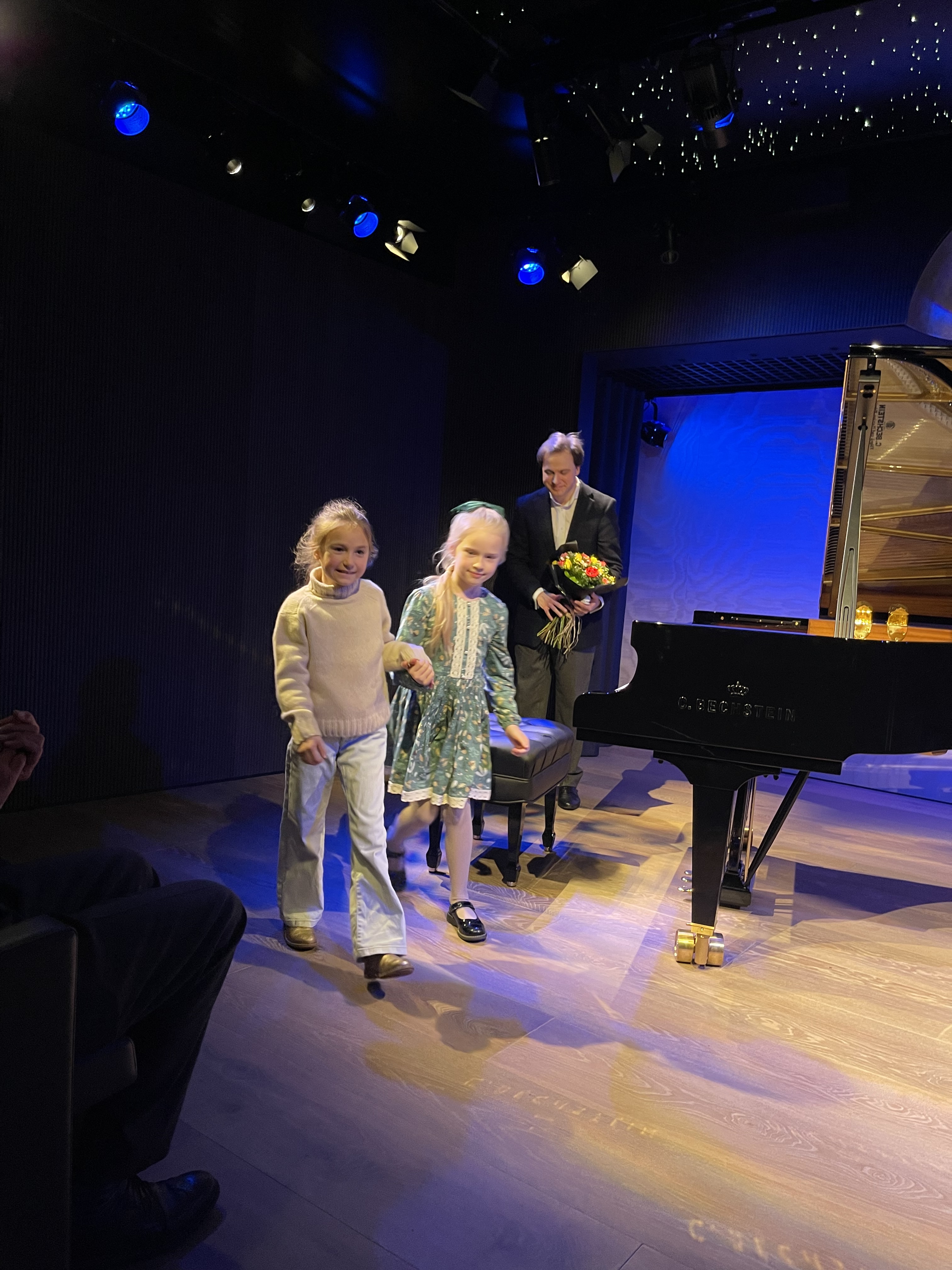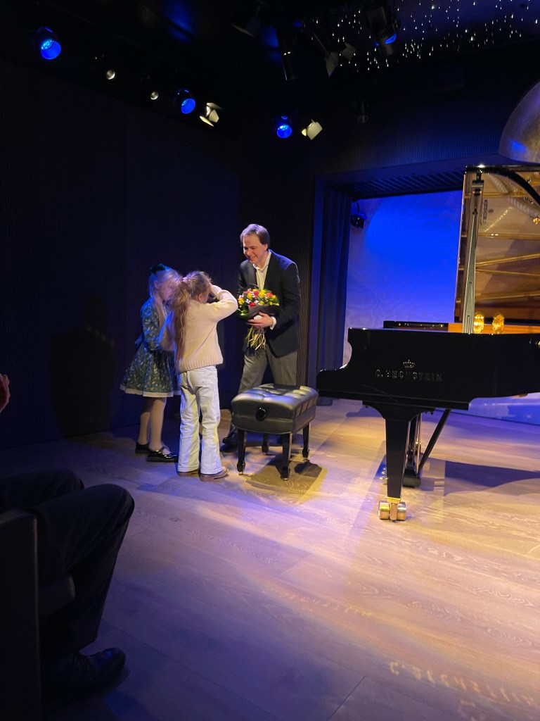 But after all these notes and the wondrous voyage we had been treated to by this Russian master it took two of his charming little students with a bouquet of flowers, almost as big as they, to persuade him to play just one more piece.