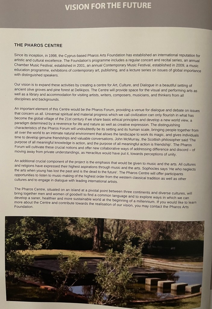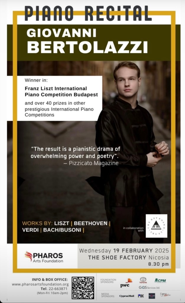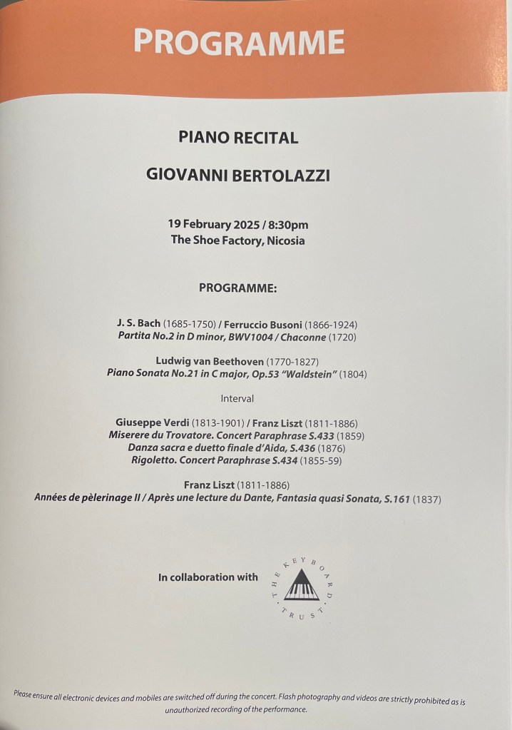Evgeny Kissin not only playing wonderfully but talking about Noretta and John so movingly on the Valentine’s Day celebration beautiful programme designed by Alison Sale Michael Tatham ,The British High Commissioner with H.E. The Ambassador of QatarGaro’s remarkable 94 year old mother Stella Keheyan with H.E.Italian Ambassador Federica Ferrari Bravo with Christopher Axworthy with dancer Jana Federici from New York Giovanni with Garo in the Shoe Factory and in the proposed site for the New Arts Centre in the Olive GroveSuperb programme notes orchestrated by the Artistic Director Yvonne Georgiadouwith Polina the resident photographer After concert dinner in the polyfunctional Shoe Factory- ‘penne all’ arrabiata’ ‘on the menu cooked by our host the Founder and President of Pharos who also offered a surprise birthday cake for Polina the photographer with music provided by Giovanni Bertolazzi pre concert rehearsal Garo presenting the concert and Giovanni’s Liszt CD’s produced by Borgato Pianos (the longest piano in the world!)with Constantinos the most important man – the piano technician Ludwig van Beethoven baptised 17 December 1770 Bonn – 26 March 1827 Vienna