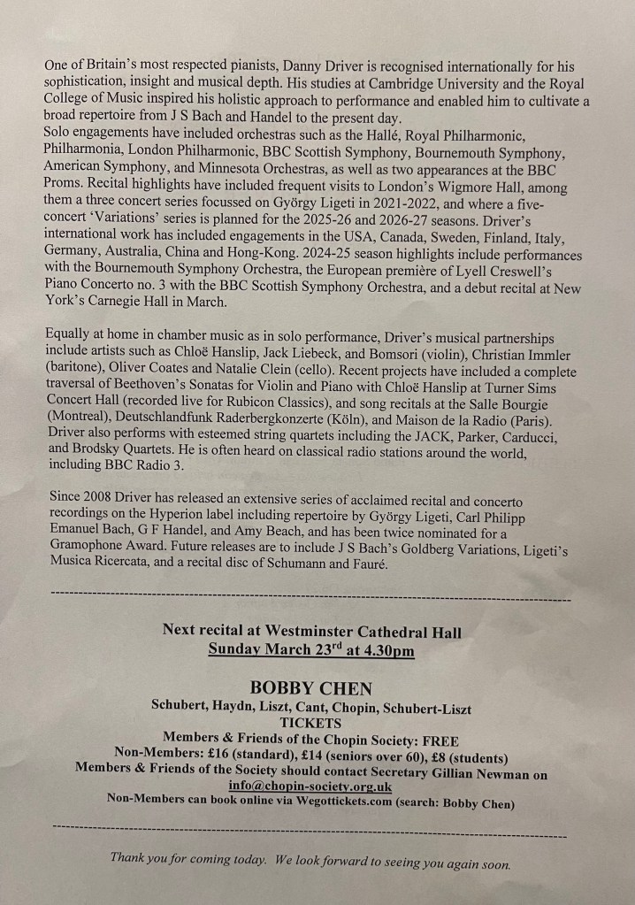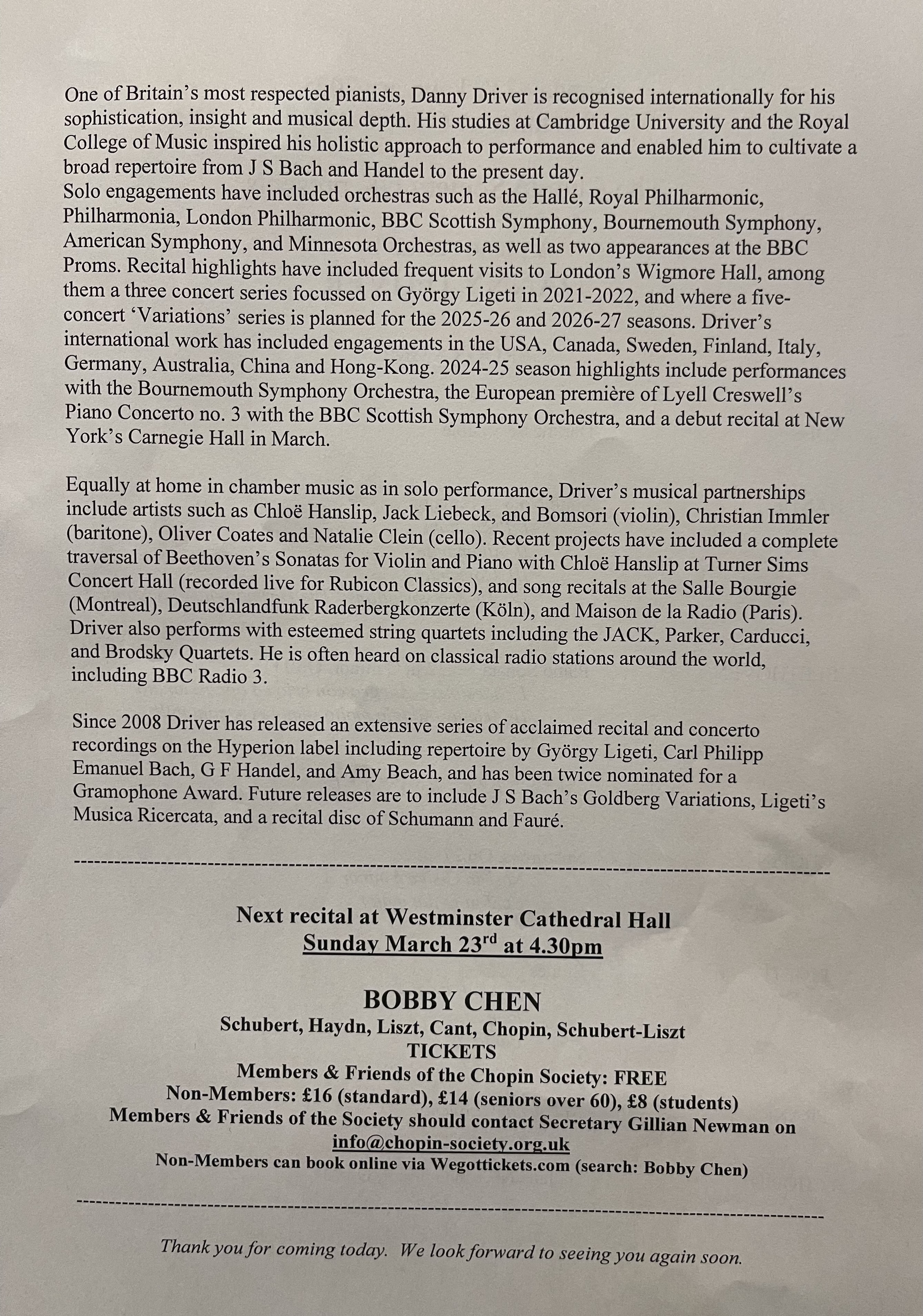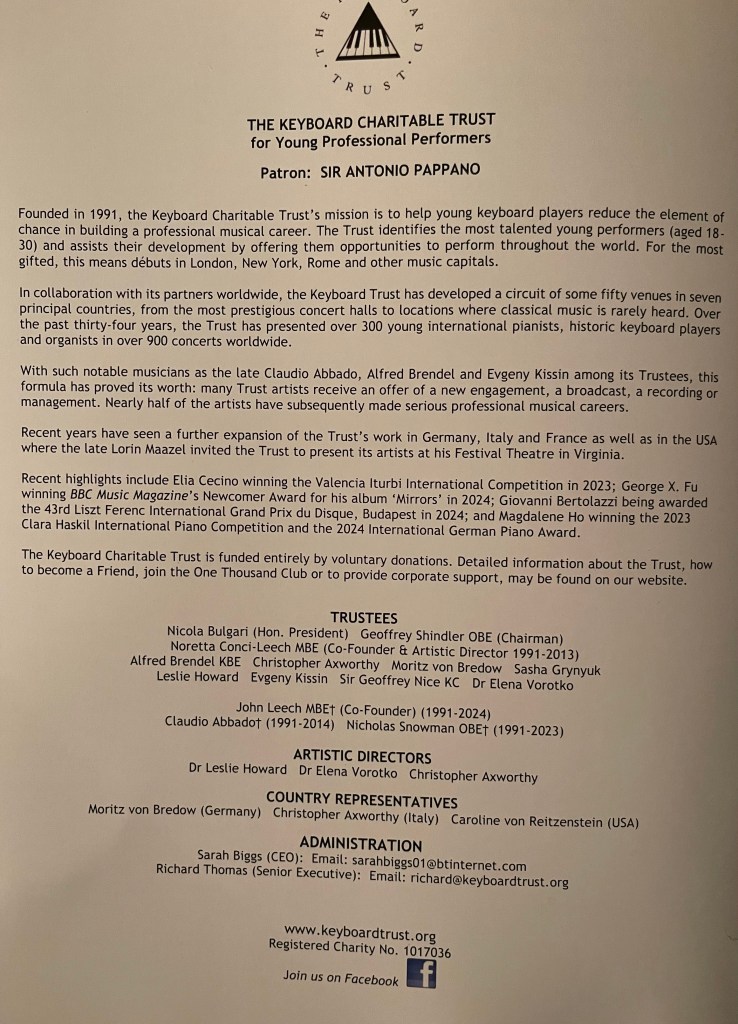 Another fine concert in the Young Artists Series at the Bechstein Hall. Jeremy Chan a young pianist I had first heard in the summer master classes that Angela Hewitt holds in her hometown of Perugia . I later discovered that he had been at school with the daughter of my first cousin, Michael Axworthy who I had become very close to in Rome where his love of music made his cruel journey with pancreatic cancer more acceptable. His wife was Ambassador to the Holy See and they were living in the Eternal City with their four children, Michael being wonderfully looked after in the ‘Pope’s’ hospital Gemelli. (https://www.google.com/url?sa=t&source=web&rct=j&opi=89978449&url=https://en.wikipedia.org/wiki/Michael_Axworthy&ved=2ahUKEwiyp7XA49mLAxVgYEEAHZeZGb0QFnoECCcQAQ&usg=AOvVaw0YhlvKhH-Yoe3SJDSJ9qIb).Triffy one of his four children with his Ambassador wife studied Japanese in University and is actually pursuing her passion in Japan.
