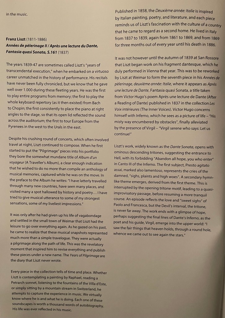 Après une lecture du Dante: Fantasia quasi Sonata also known as the Dante Sonata is a piano sonata in one movement, writen in 1849. It was first published in 1856 as part of the second volume of his Années de pèlerinage (Years of Pilgrimage) and was inspired by the reading of Victor Hugo’s poem “Après une lecture de Dante” (1836).The Dante Sonata was originally a small piece entitled Fragment after Dante, consisting of two thematically related movements , which Liszt composed in the late 1830s.He gave the first public performance in Vienna in November 1839. When he settled in Weimar in 1849, he revised the work along with others in the volume, and gave it its present title derived from Victor Hugo’s own work of the same name and was published in 1858.