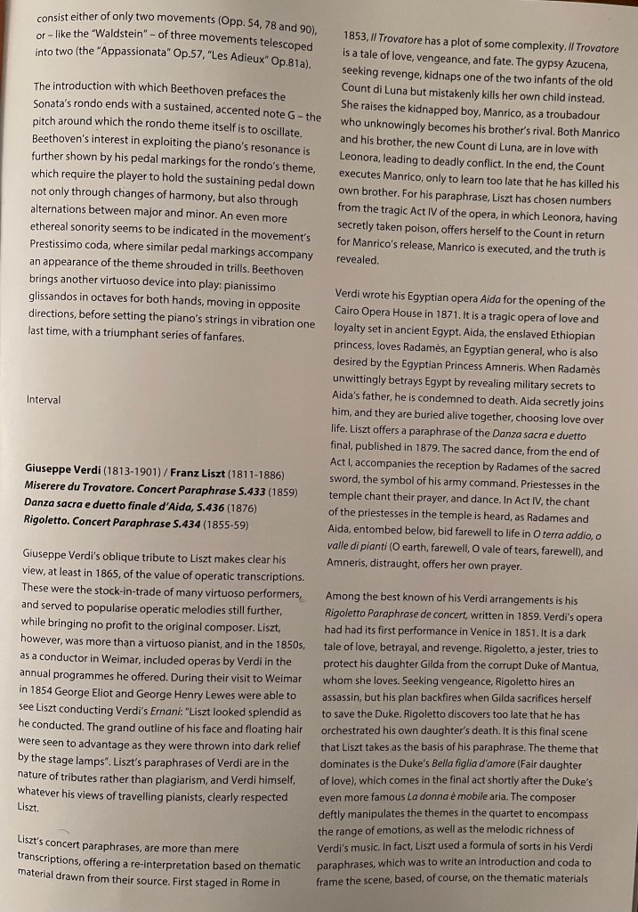 First staged in Rome in 1853, Il trovatore has a plot of some complexity. The troubadour of the title, Manrico, is the supposed son of the gypsy Azucena, but actually the stolen child of the old Count di Luna, a rebel and declared enemy of the young Count di Luna. Both are in love with Leonora, and Manrico, in his stronghold, is preparing to marry her, when news comes of the imminent death of his supposed mother, taken by the Count and condemned to death by burning. In his attempt to save her, Manrico is taken prisoner by the Count. In the fourth act Leonora, brought to a place outside Manrico’s prison, thinks to bring him new hope. From the tower the Miserere is heard, Miserere d’un’ alma già vicina / Alla partenza che non ha ritorno! (Have mercy on a soul already near / To the parting from which there is no return). Leonora’s horrified exclamation, Quel suon, quelle preci solenni, funeste (What sound, what solemn, mournful prayers) leads to Manrico’s Ah che la morte ognora / È tarda nel venir (Ah how slow the coming of death), from the tower, his farewell to his beloved. Once again Liszt has chosen the point of highest tragedy for his 1859 paraphrase. It is followed by Leonora’s offer of herself to the Count, in return for her lover’s release, having secretly taken poison, her death, and that of Manrico, executed, but now finally revealed by Azucena to the Count as his own brother.