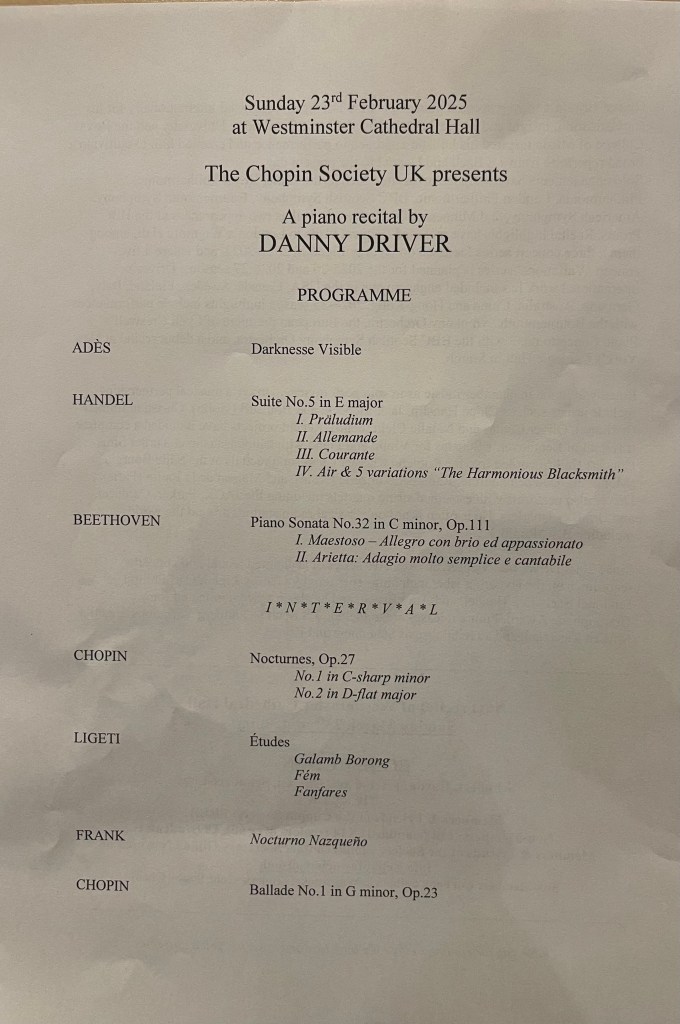 Danny Driver with the Midas touch of a great artist bewitches and bewilders the Chopin Society with wondrous Chopin and monumental Beethoven mixed with superhuman feats of transcendental pianistic control in Adès, Ligeti and Frank