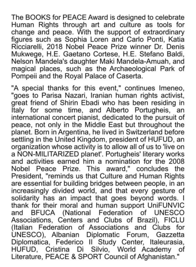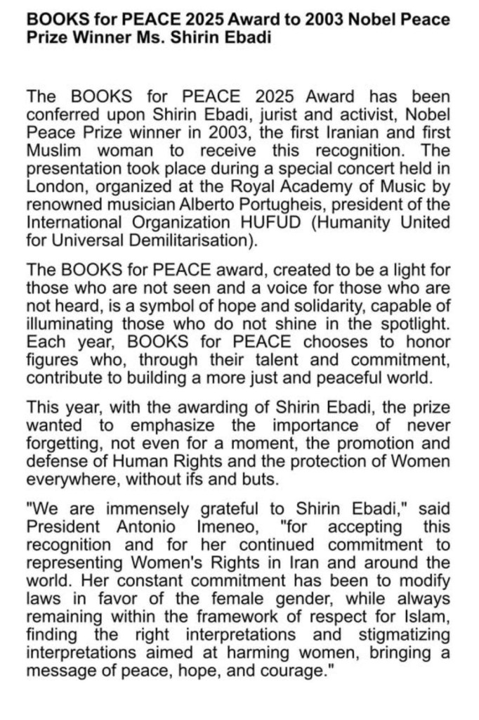 Alberto as president of HUFUD – Humanity United for Universal Demilitarisation – was very honoured to share the platform with such a distinguished guest, who was awarded the Nobel Peace Prize for her pioneering efforts for democracy and women’s, children’s and refugee rights. She was the first Muslim woman and the first Iranian to receive the award and has lived in exile in London since 2009 https://en.wikipedia.org/wiki/Shirin_Ebadi