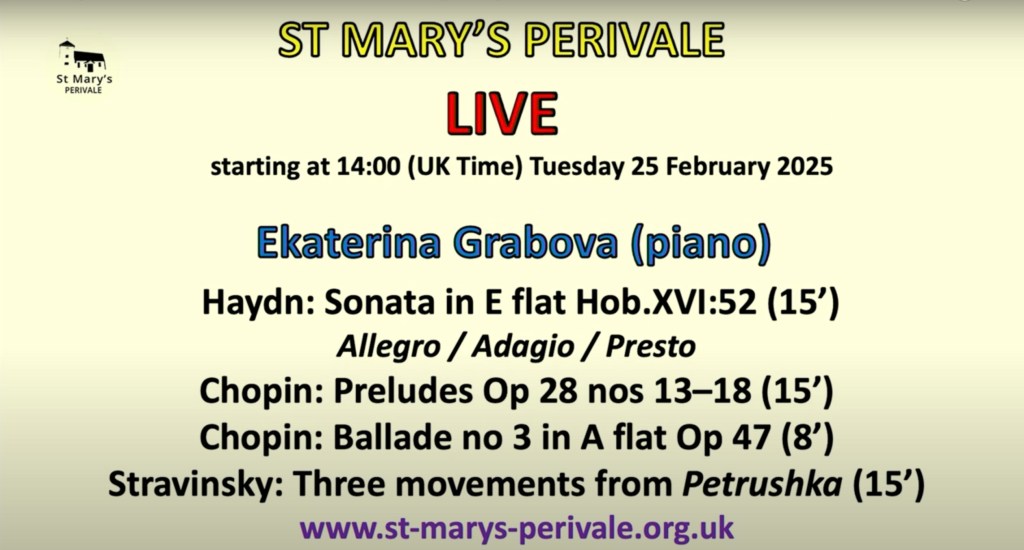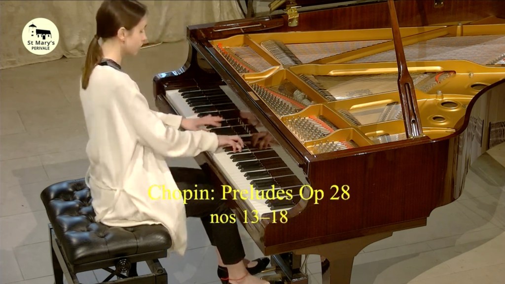 Fascinating to discover yet another very fine young artist via Dr Mather and his team in Perivale. Here is a young lady who quite simply loves the piano and who with humility, musical integrity and refreshing innocence played a varied programme of Haydn, Chopin and Stravinsky with a quite remarkable musical and technical perfection. She reminds me very much of one of Gordon Green’s star pupils Anne Shasby, a musicians’ musician, similar in many ways to the artistry of Andras Schiff where music seems to pour so naturally out of their sensitive fingers. It is playing ,above all, of a musician delving deeply into the scores to find the intentions of the composer with the ink still wet on the page. This is Art that conceals Art with a subtle mastery where showmanship or mere note spinning have no place.
