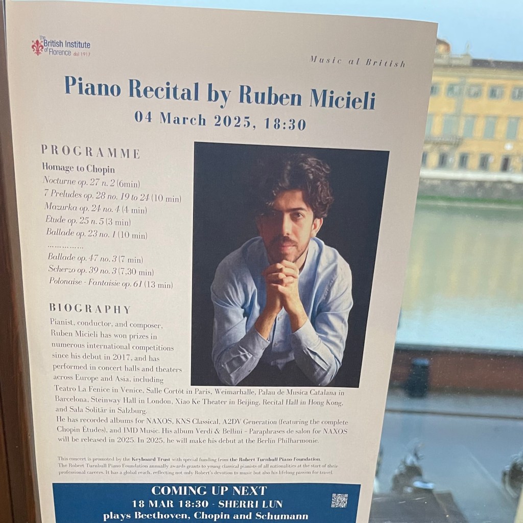 A standing ovation for Ruben Micieli at the end of a concert dedicated to Chopin. Not only a celebration in Chopin’s 215th birthday week but also the news that Ruben has been selected to go to Warsaw as part of the Chopin competition selection process. Performances of subtle beauty and mastery that began with the whispered beauty of the D flat nocturne. Ruben allowed Chopin’s bel canto to cast a spell as you might expect from a young musician born in the shadow of Bellini in Catania. Beautiful hand movements of grace and beauty the same as in one of Chopin’s most beautiful creations. A whispered veiled sound world of ravishing beauty.