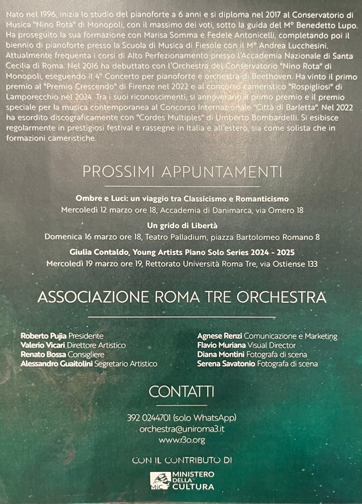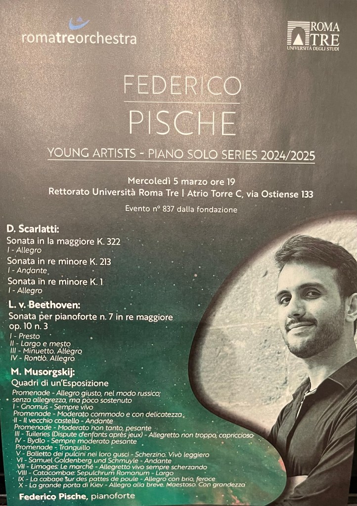 Federico Pische in the Young Artists series at Roma 3 University . From the class of Benedetto Lupo with a programme of Scarlatti, Beethoven and Mussorgsky. Played with a musical intelligence and integrity where his technical mastery was at the service of the composers he was playing and just underlined the title he had given to his recital of ‘Form and Significance’. Crystalline purity of three Scarlatti Sonatas, a poignant profundity to the early Beethoven Sonata op 10 n 3 where the Largo e mesto already marks out the genius that was to recreate the sonata form, bringing it to the celestial heights of his final trilogy. But it was Mussorgsky that marked this young man out as an artist of refined good taste and remarkable technical mastery. A pianist who listens to himself with a sensitivity to balance and a kaleidoscopic range of colours can bring this old war horse back to where it truly belongs as one of the pinnacle’s of the pianistic repertoire.