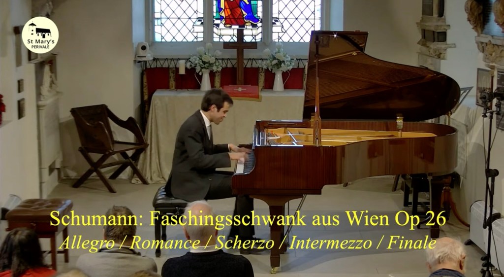 The opening of Schumann’s ‘Carnaval Jest’ was like the Beethoven, rather breathless, with Parvis’s wish to show us the architectural shape of the opening ‘Allegro’ rather than risking taking a little more time to breathe. I remember a famous pianist friend playing the Schumann Concerto in Rome with a good but not well established ensemble. In the rehearsal she mentioned to the conductor that in various places she liked to breathe .Oh,my dear,he exclaimed, that is very dangerous! It is a risk, but one that I feel Parvis can now allow himself, seeking to be free from architectural constraints and to just turn corners with a little more self indulgence.The indulgence that he did bring to the ‘Intermezzo’, that he played with admirable passion and freedom, allowing the music to unfold with ravishing beauty of romantic intensity.The ‘Romance’ ,too, was played with disarming simplicity and beauty and the ‘Scherzo’ thrown off with admirable nonchalance and ease. There was a rhythmic drive to the finale but here, as in the first movement, the lyrical passages were not given the time that they needed to speak with Schumann’s unique voice – that of Eusebius the poet of his soul.