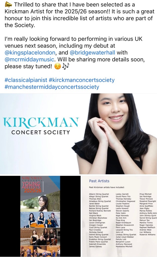 Sherri Lun, named ‘2020 Performing Artist of the Year’ by the South China Morning Post, has garnered acclaim for her “pinpoint clarity and convincing bravura” (Chicago Tribune). Born in Hong Kong and currently based in London, Sherri has swiftly established herself as a rising soloist on the international stage. A Young Scholar of the Lang Lang International Music Foundation, Sherri made her concerto debut at the Ravinia Festival with the Midwest Young Artists at just 10 years old. Since then, she has performed in prestigious venues including Wigmore Hall in London, Fondation Louis Vuitton in Paris, and Millennium Park in Chicago. Her international appearances span the UK, US, France, Germany, Austria, Italy, Spain, Malaysia, and China. Sherri has also collaborated with esteemed ensembles such as the Salzburg Chamber Soloists, Hong Kong Youth Orchestra, and Kölner Kammerorchester. Recent performances include the Hammerklavier International Piano Series in Girona, the Festival Musicale delle Nazioni in Rome, a 4-concert Malaysian tour, recitals in Steinway Hall London and Drapers’ Hall. In December 2023, she released her debut album with KNS Classical, featuring works by Robert Schumann and César Franck. Sherri’s artistry has been recognized with top prizes in numerous national and international competitions. Most recently, she won First Prize and Audience Prize in the 2024 Birmingham International Piano Competition, following her First Prize win at the 2023 Hong Kong Generation Next Arts Competition. Sherri also won top prizes in the Robert Schumann Competition (Du¨sseldorf), Zhuhai International Mozart Competition for Young Musicians, ASEAN International Chopin Piano Competition, Singapore International Piano Competition, and Steinway & Sons Youth Piano Competition, to name a few, and is a quarter-finalist of the 2024 Hamamatsu International Piano Competition. At the Royal Academy, she won consecutively the 2022 Sterndale Bennett Prize, 2023 Chung Nung Lee Prize, and 2024 Harold Craxton Prize. She was also invited to perform in RAM’s 2022 Bicentenary celebration concert in Wigmore Hall. In Hong Kong, she is a frequent winner of local competitions, and her performance has been broadcasted by the Radio Television Hong Kong. Born in 2003, Sherri majored in piano and viola as a junior student of the Hong Kong Academy for Performing Arts. She is currently studying under Prof. Christopher Elton at the Royal Academy of Music on a full scholarship, supported by both the Academy and the Hong Kong Scholarship for Excellence Scheme. She is also an artist with KNS Classical and the Keyboard Charitable Trust. For more information, visit http://www.sherrilun.com.