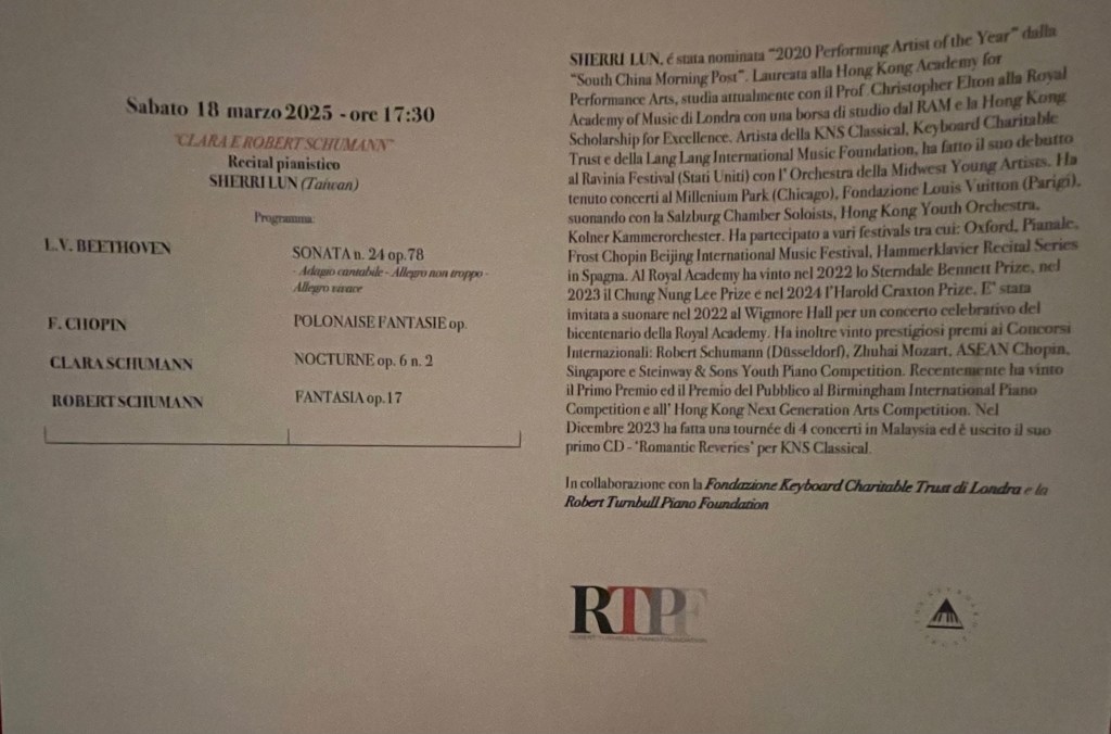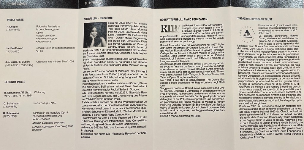 This time for the appearance in Vicenza in the historic collaboration with the English Trust,created by Noretta Conci with her husband John Leech, (Noretta had been a student and assistant of Arturo Benedetto Michelangeli) , there appeared another association that sponsors young concert artists on their International tours : The Robert Turnbull Piano Foundation giving scholarships to young pianists from all parts of the world in memory of the young pianist who died of linfoma in 2018.