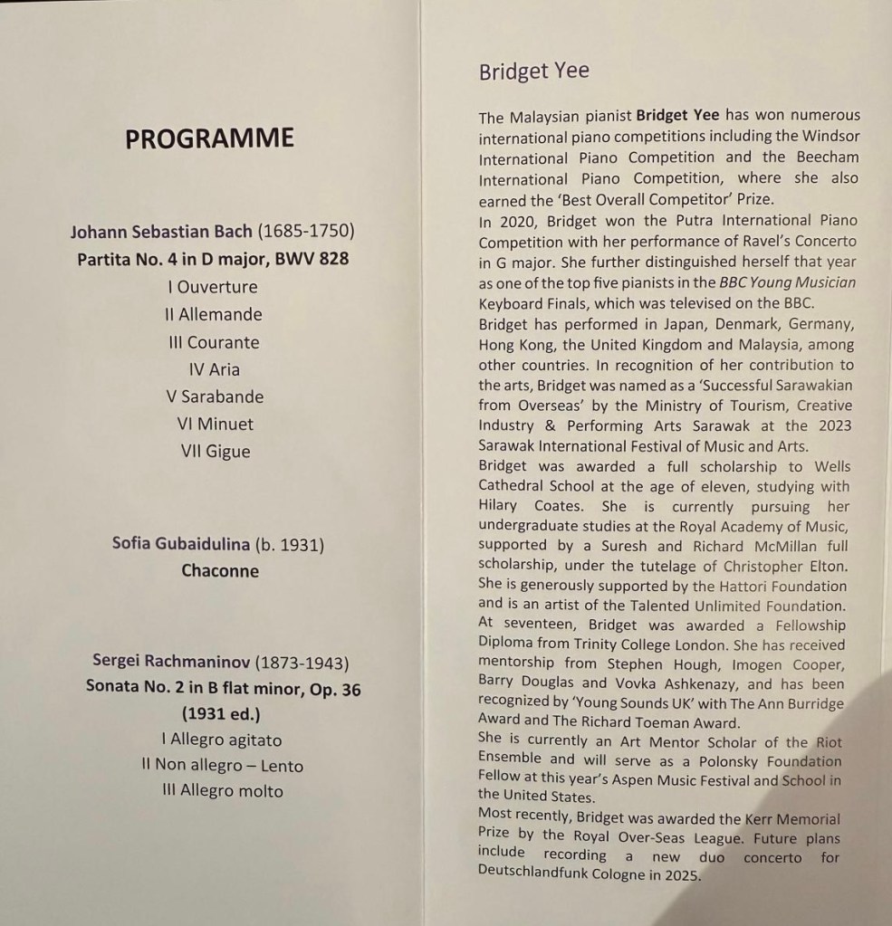 Elena Vorotko co Artistic Director of the KT writes : ‘Bridget Yee, effervescence of youth with a heart of gold. From the first bright runs of the Bach Partita, through the mind-bending complexity of Gubaidulina’s Chaconne to the last luscious chords of the Rachmaninov Sonata, Bridget’s sweet nature, enthusiasm and passion for music shone through. All the pieces were her favourites and it showed – there was complete command of the material and the pleasure she took in shaping her musical sentences and voicing her textures brought delight to the audience too. The Bach had a balance of flexibility and pulse and an enviable crispness and lightness of finger work. Some of the lyrical movements spoke with moving fragility and genuine charm. The final Gigue was full of fireworks which was just a glimpse of treats to come! The following Chaconne by Gubaidulina was written in 1962 for Marina Mdiwani, winner of the first Tchaikovsky Competition and a student of Emil Gilels. The composer said that she tailored the piece to the pianist who was of lively temperament and could play amazing chords. The construction of the piece is very clever, as was expressed by Bridget in the discussion after the concert, the 23 note row is manipulated in many different ways, often made evident to a lay listener, while constructing a tremendous architecture of a marriage between a Chaconne and a Passacaglia. Bridget’s grasp of the musical ideas was astonishing as she took us through the narrative in one breath. But her true heart revealed itself in the first notes of the Rachmaninov Sonata, of which she is hoping to make her own version one day. The golden warmth of sound and the organic moulding of her phrasing took us to another realm. Tremendously virtuosic, her technique, always serving the music, created breathtaking moments of genuine beauty and power. This young lady, so full of enthusiasm for life, art, mountains and music has a lot of joy to give this world. We look forward to witnessing her flourish.
