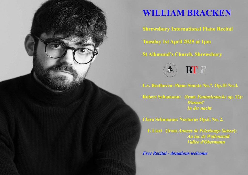 William Bracken is in demand as a recitalist, concerto soloist, chamber musician and teacher. The Wirral-born pianist has won numerous awards including 1st prize at the 2022 Liszt Society International Piano Competition, 1st prize, press prize and audience prize at the 2023 Euregio Piano Award international piano competition and 3rd prize at the 2024 UniSA international piano competition in South Africa. He is currently continuing studies at the Guildhall School of Music and Drama in London where he also holds a position as teaching assistant in the Centre for Creative Performance and Classical Improvisation. Concert highlights include several concerto performances at The Barbican, Liverpool Philharmonic Hall, St. John’s Smith Square and recitals at Chipping Campden Festival, LSO St. Luke’s and most recently Wigmore Hall, where he was praised by the Telegraph for his “courage and stamina and musicality in abundance” and “an ability to hold an audience in the palm of his hand”. He also made his New York debut at Carnegie’s Weill recital hall in January 2024. William performs a large and diverse range of repertoire and also has a keen interest in jazz and improvisational elements of performing classical music. He is a founding member of Ensemble+, a chamber collective focused primarily on challenging preconceptions about live music through the medium of improvisation and is a current artist diploma student at the Guildhall School of Music and Drama studying with profs. Martin Roscoe and Ronan O’Hora.
