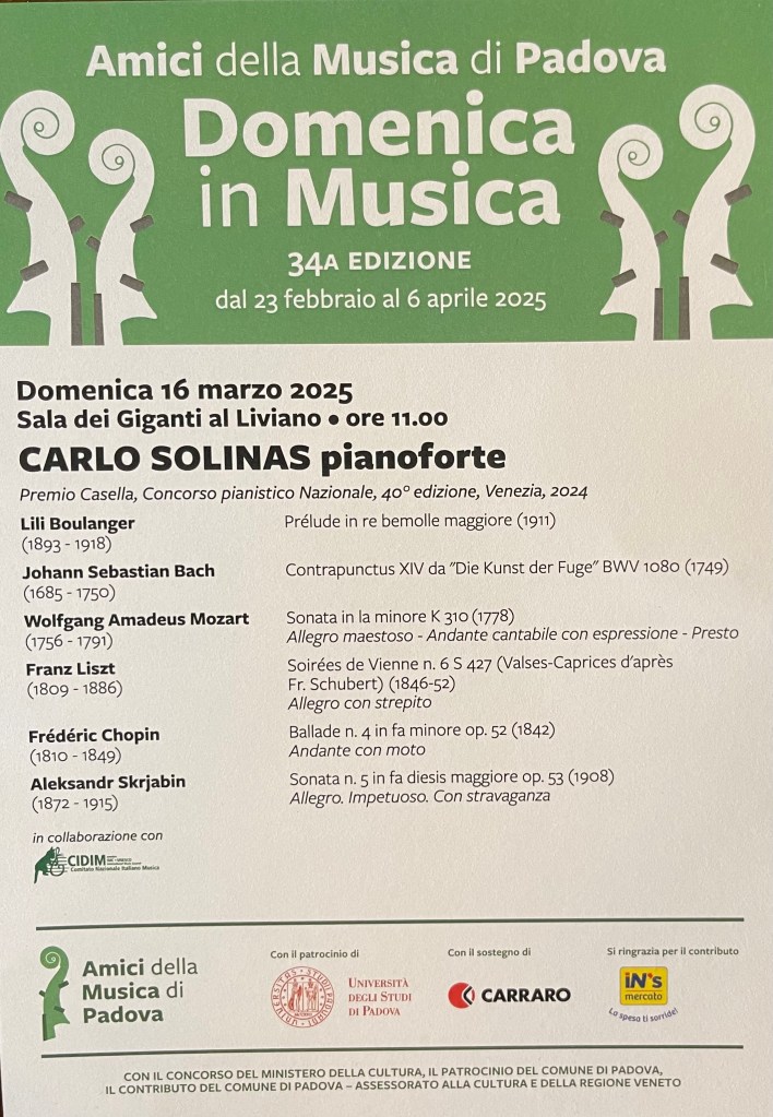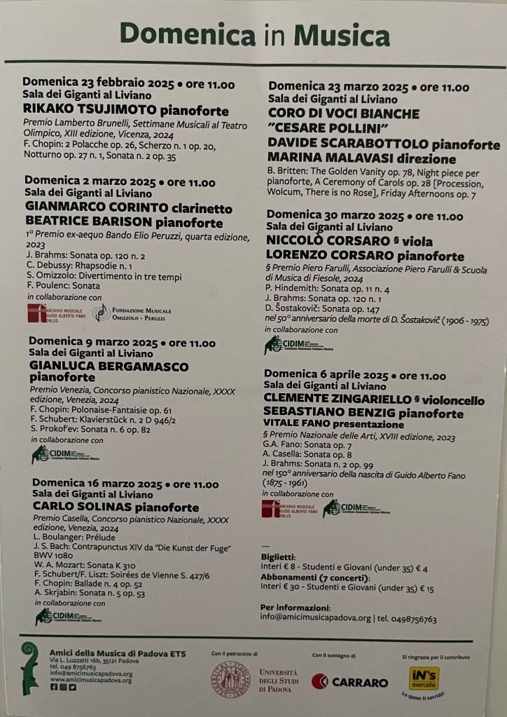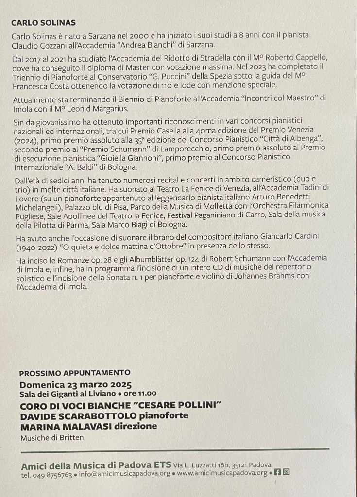 Coming full circle like the great thinking musician that was revealed to us today, Carlo played Bach’s Prelude and Fugue in F minor book one ,with the same same kaleidoscope of colours and intense musicianship with which this voyage of discovery had been shared with a large audience on this Sunday morning in a truly radiant and resplendent Padua .