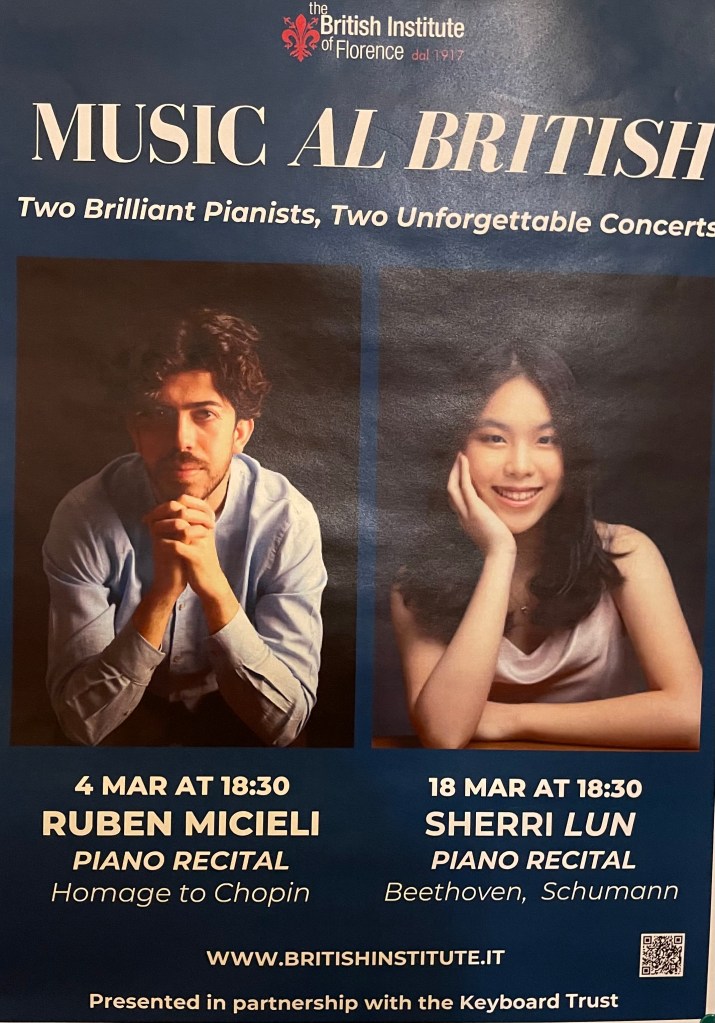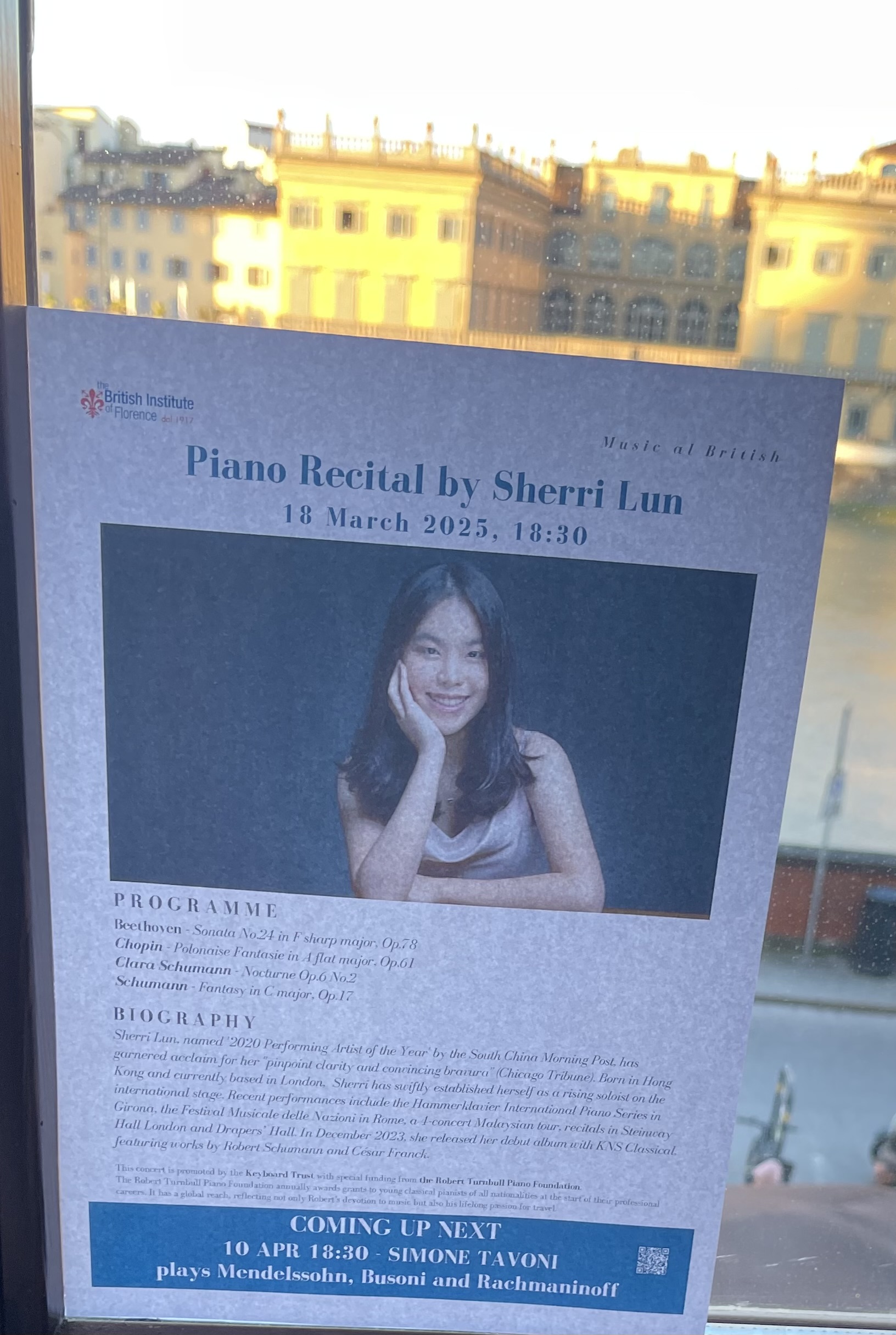 The Keyboard Trust and the Robert Turnbull Piano Foundation together with Music al British in Florence presented Sherri Lun with a fascinating programme that started and finished with two of the most important works in the Romantic piano repertoire. Chopin’s last great masterpiece the Polonaise- Fantasie where Chopin had created a completely new form that was so revolutionary for it’s time that it was only many years after his death that it was finally recognised for it’s genial invention and poetic beauty. Beethoven’s shortest Sonata,but one of the composers favourite for it’s beauty and simplicity, opening the gate to the composers last period of his thirty two sonatas that spanned his entire life story.