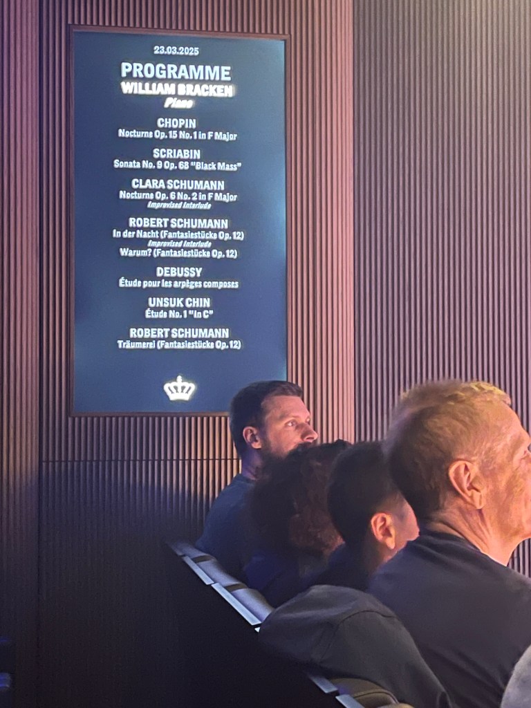 A forty minute programme played almost without a break as he united Clara and Robert with an umbilical of improvised transitions from one piece to another. This was quite the norm in the hall just next door in the early 1900 ‘s when artists such as De Pachman would join the pieces together and also give a running commentary as to how they were progressing .Will did not go that far but it shows off the skill of a real musician who is not only an interpreter but also a transmitter of emotions and atmosphere’s .