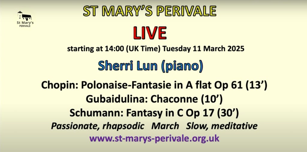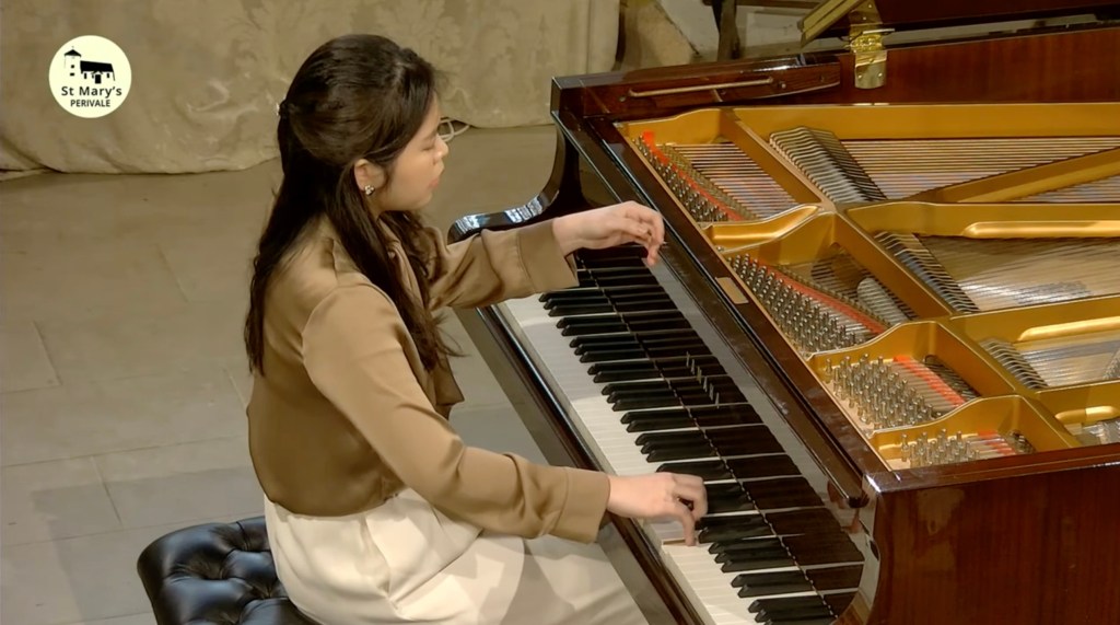 Some remarkable playing of great maturity from this twenty two year old pianist from the class of Christopher Elton at the Royal Academy in London. A class where above all musical values are the basis for a profound study of the score, taking for granted a mastery of the keyboard but explaining the style and the very meaning behind the notes. It is only from this beginning that the true meaning of technique can be understood and mastered. It is born from a wish to delve ever deeper into the score to find the meaning of the music when still wet on the page. It was exactly this that came across in all that Sherri played today.Two Fantasies,both representing the pinnacle of the Romantic piano repertoire, and a Chaconne not by Bach but by the 93 year old Sofija Gubaidulina written for the winner of the Tchaikovsky competition in 1962. The most notable thing about Sherri’s playing is the limpet type weight that her fingers have as they cling to the keys, never hitting them but sucking the sound out with an enviable concentration that denies any showmanship or eccentricities.This was a pianist who listens to every sound she was making with a mastery and intelligence that would be the envy of pianists twice her age!