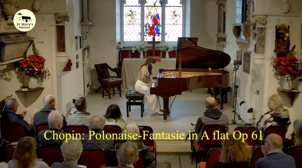 Chopin’s Polonaise- Fantaisie is one of his last works,when he had found a unique form that united the Polish dance with the fantasy of a poetic genius. Sherri played it with aristocratic authority, where notes we have heard many times before now had a significance and meaning that demanded our attention. The opening imperious chords were allowed to vibrate over the entire keyboard with a single web of sound that are true reverberations of the soul. Sherri realised this and played the notes with one beautiful movement ( so often divided up between the hands to make it pianistically easier).It was her total identification with the music, where the beauty of the music was the same natural beauty of the shape of her hand and body. A sumptuous glowing sound as the Polonaise could be heard in the distance gradually advancing with the clarity of the knotty counterpoints that link the episodes together. Ornaments that sparkled like jewels and just showed Sherri’s mastery of the pedal and above all mastery of true legato. A poignant introduction to the central episode was played with timeless beauty and opened up to a chorale of ravishing depth of sound and control. Chopin’s counterpoints just adding to the beauty that was unfolding with a clarity that was never intrusive but just contributing to the magic that was being recreated. There was a beautifully judged build up to the heroic climax where she created the culmination of nobility and aristocratic control with breathtaking exhilaration, dying away to a mere whisper before the final bare A flat.