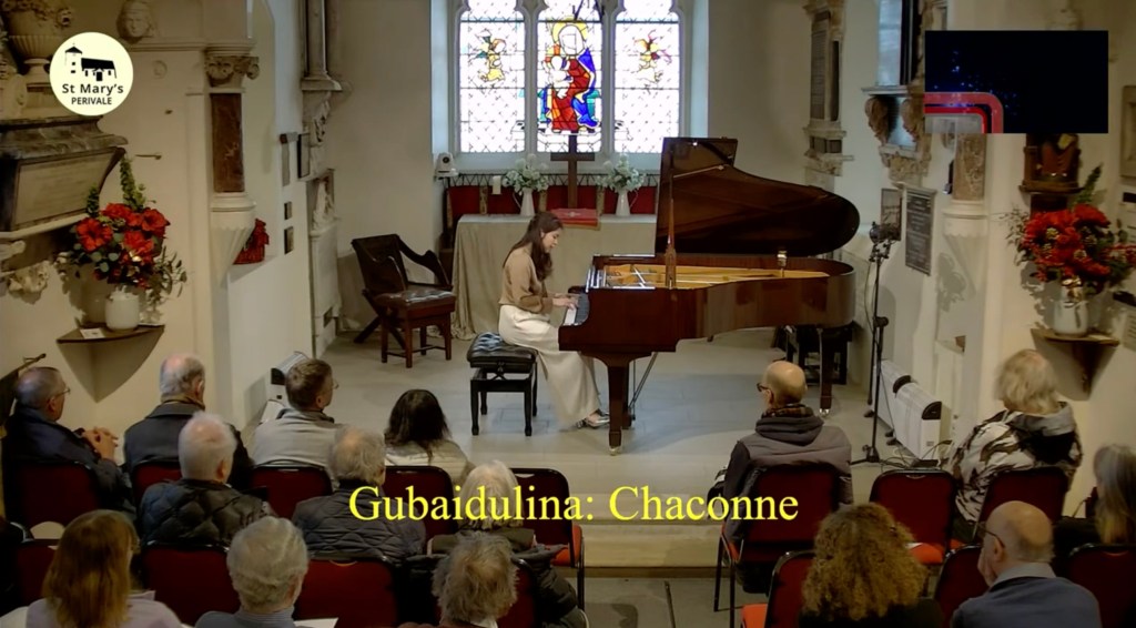The Gubaidulina Chaconne opened with imperious authority of luminosity with a kaleidoscope of colours.There was a great clarity even with such a knotty web of sounds. Played with a transcendental mastery but always with an architectural shape that could reconcile the fervent outpourings with the actual overall shape of this extraordinary work. Astonishing mastery of non legato and legato and with the use of the pedal that even allowed for such clarity. Ending as it had begun with nobility and unashamed declamations of intensity and strength. Sherri had warned us in advance that this was a different sound world from Chopin and Schumann .It was a work that had touched her deeply and that she wanted to master and be able to share her enthusiasm with others, which she certainly did today with fearless courage and masterly authority.