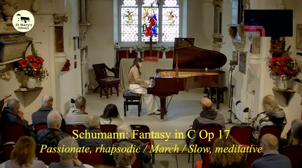 Sherri is also an inquisitive musician and her encore by Clara Schumann was the Nocturne op 6, that echoes the melody of Robert in the fantasy and was published in the same year . It was played with the same weight and aristocratic beauty as the fantasy with a sense of yearning that was a deep lament for Robert as his Fantasy had been for her .