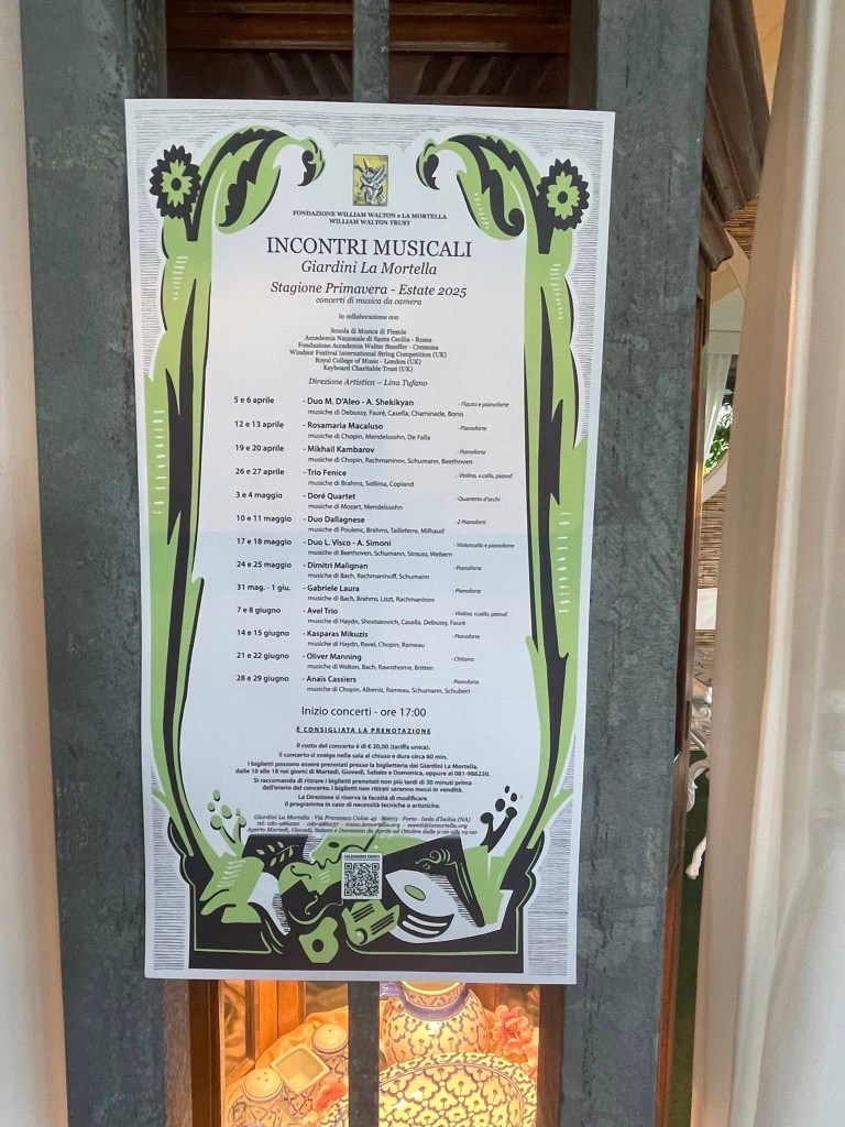 This is my 8th visit to the Walton Foundation bringing wonderful young musicians to breathe the rarified air that was the intent of William and Susana Walton.Their wishes are being respected with dedication and warmth, the founders looking on from their perch where they can view the world inside and out of La Mortella .
