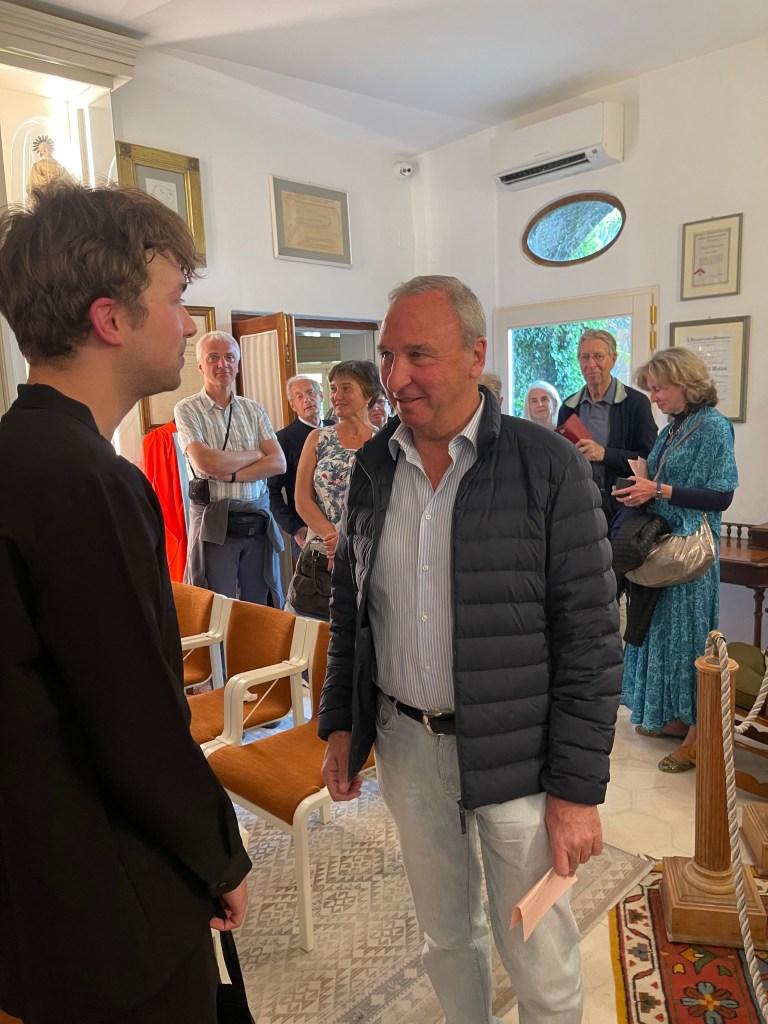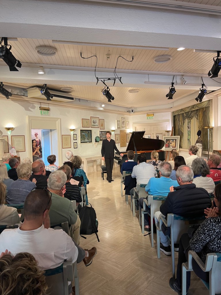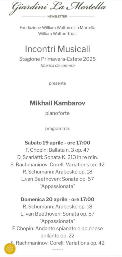 Leaving his hand on the final note, which he miraculously transformed into the whispered opening of Beethoven’s ‘Appassionata’. There was an extraordinary dynamic range and sense of drama that kept us on the edge of our seats. A scrupulous attention to Beethoven’s very precise indications meant that seemingly impossible explosions of notes were played with the struggle that Beethoven implied, not simplifying the execution by sharing between the hands. This is not play safe music but only for the fearless that dare open the door to a revolutionary work of its day. Performances that even today should still have that same astonishing struggle that Beethoven was to bequeath to the world. The music like a tightly spun spring unfolding with breathtaking drive and intensity. Even the return of the theme was over a bubbling cauldron of sounds boiling over at 100 degrees. Beethoven’s revolutionary and poetic effects were interpreted with remarkable authentic intuition and the final pedal effect of the coda came after an astonishingly violent chord out of which a whole world was allowed to dissolve and disappear into the distance, where we were to envisage a funeral procession of sumptuous beauty. An ‘Andante con moto’ played with sumptuous rich sounds of string quartet quality, where every strand has a meaning and poignant significance. The variations unfolded with beauty, the deep legato bass of the first with chords interjecting unusually promptly above, which contrasted with the golden beauty of the second mellifluous variation. Gradually building in agitation until the astonishing unsettling chords of the diminished 7th, firstly barely suggested and then thrown at us with Beethovenian vehemence. The continual drive of the ‘Allegro ma non troppo’ , Mikhail played with relentless forward movement of turbulent control. Exhilaration and excitement of the coda brought this recital to a astonishing end and an ovation from a Saturday afternoon audience who had come to admire the beauty of Susana’s Ischian Paradise and were not expecting to be astonished by the presumption of Beethoven.