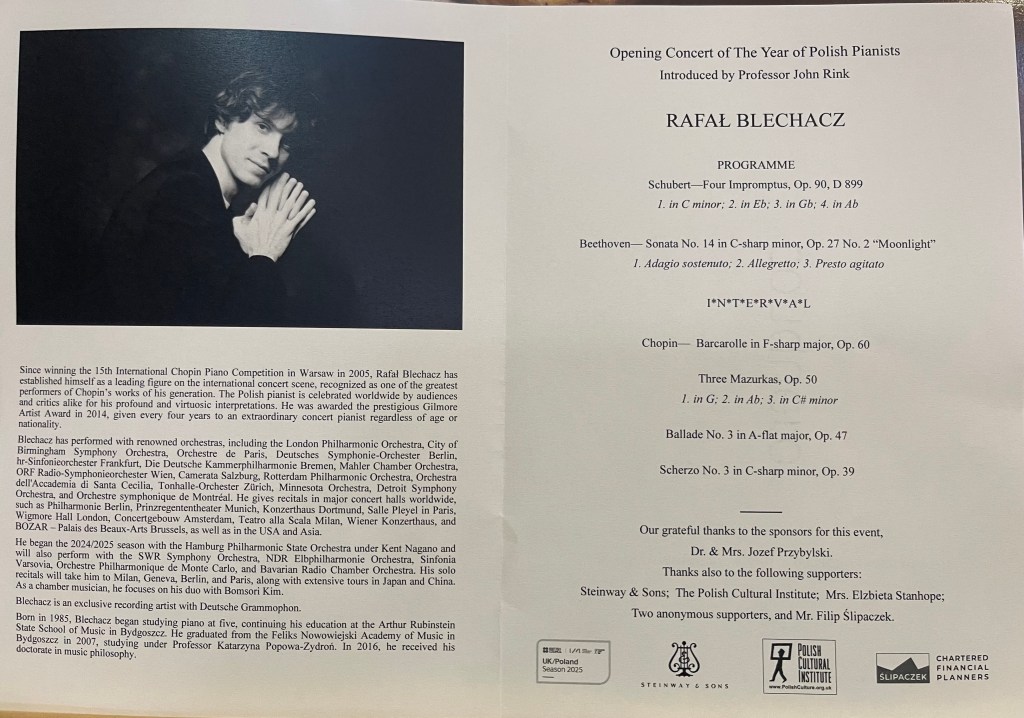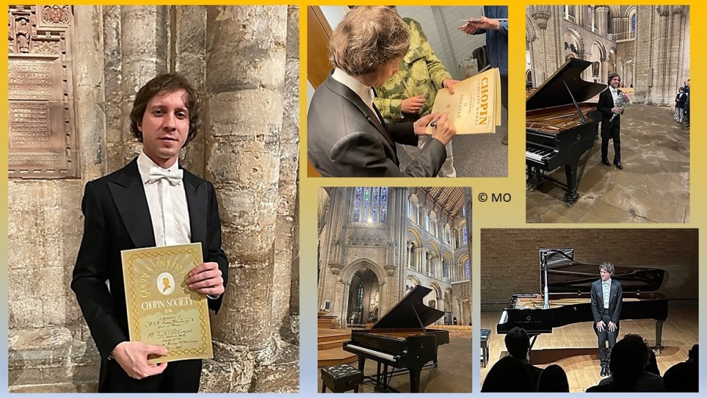When asked last month in Germany by Zsolt Bognar, where he feels most creative, Rafal Blechacz responded that “most definitely on stage”. When I’m in a practice room or my studio at home, I have some ideas but the moments with the public; that special atmosphere gives me freedom. I cannot imagine life without playing public concerts” – concludes our Star Pianist, who – as you can see from the enclosed photo – is already impressed by the Chopin Society UK activities. I have no doubt that he’ll find the same with our audience this Sunday.