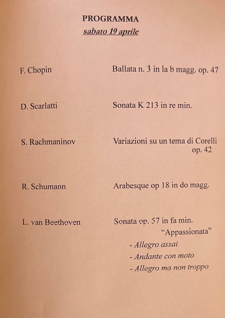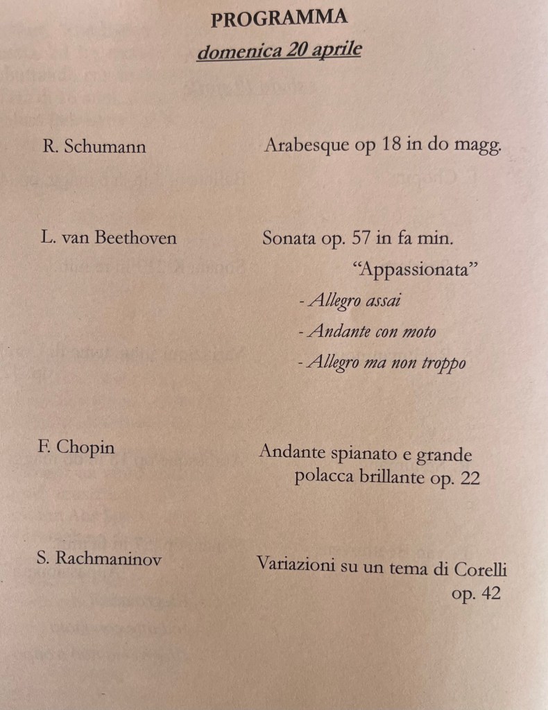 The second concert in Ischia there was another work by Chopin: the ‘Andante Spianato and Grande Polonaise’ op 22 in place of the ‘Third Ballade’. And what a performance this was ,truly worthy of the great pianists of the past, with a ‘jeux perlé’ at the end of the Polonaise that I have never heard played with such refined elegance and supreme golden sounds of ravishing beauty. An ‘Andante Spianato’ of exquisite beauty and subtle phrasing, always supported by sumptuous bass harmonies of luxuriant velvet clad intoxicating beauty. Interrupted by the orchestral introduction to the Polonaise where the pizzicato notes I have never heard played with such a delicate diminuendo as they lead the way to the Polonaise, that was played with suave elegance. A ‘joie de vivre’ of refined playfulness with an extraordinary sense of measure and balance. Even the octave declarations were played with a mellifluous beauty and not the more usual hard hitting showmanship.There was also a subtle beauty as light was shed on certain inner notes, like a will o’ the wisp lighting up the night sky with their magic wand. A quite extraordinary performance where I am not sure if it was he or us that was having such self indulgent enjoyment .