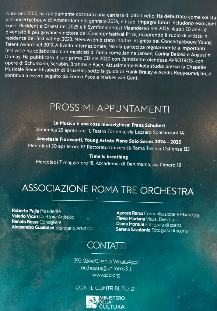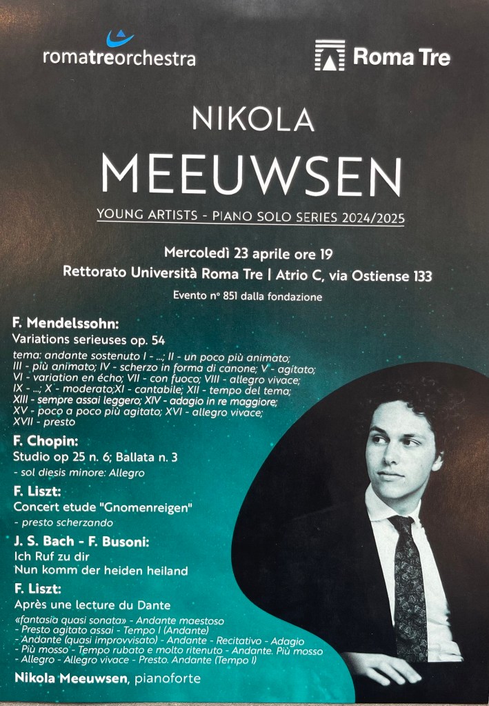 It is nice to be back for another in the Roma 3 Young Artists Series. A concert series that Valerio Vicari has created to give a platform to the enormously talented Italian pianists who are ever more numerous and headed for important careers. Today there was, exceptionally, a Dutch pianist but who had received his important training in Italy with Enrico Pace at the Imola Academy. Nikola Meeuwsen is now completing his studies with Frank Braley at La Chapelle in Brussels but always under the eagle eye of Enrico Pace