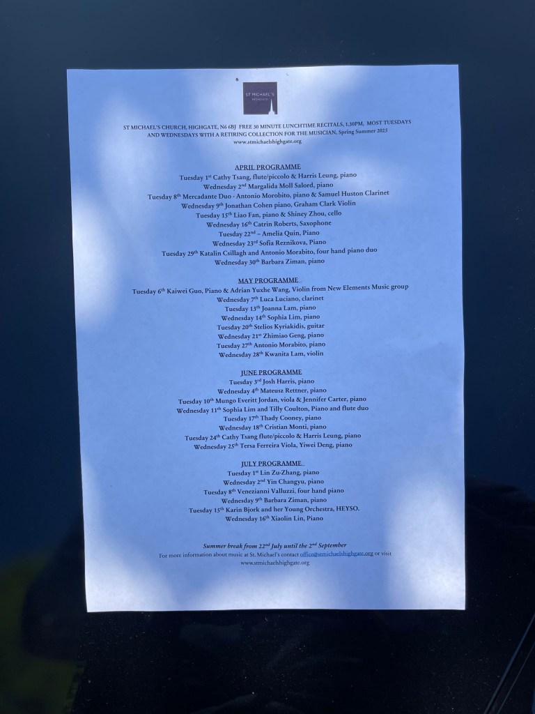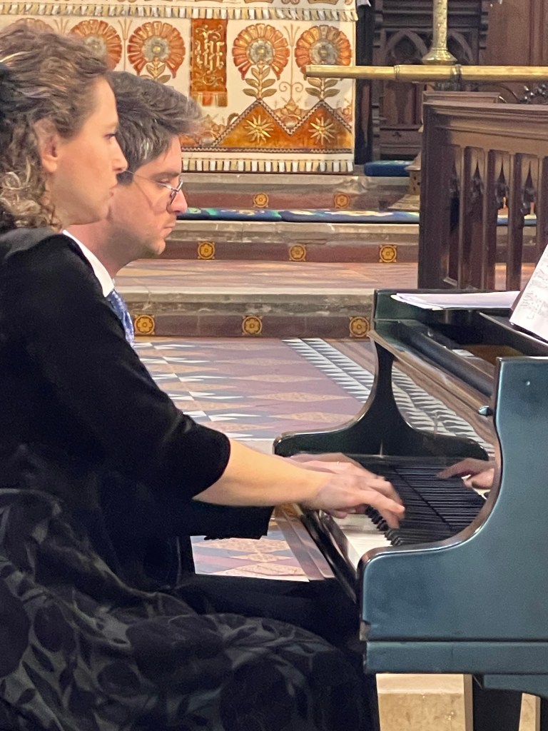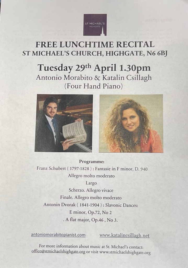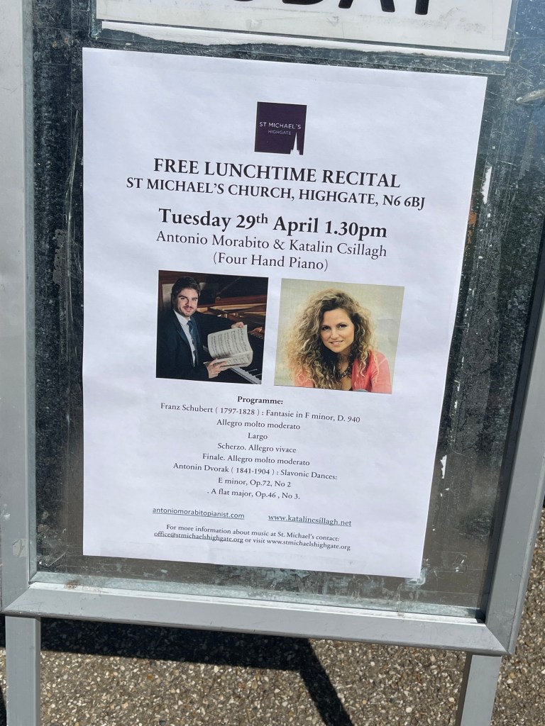 A monumental declaration of poignant nobility where,every so often , a ray of sunlight would appear allowing Schubert’s unending melodic invention to beguile and haunt us before bursting into the Scherzo. The final ‘fugato’ was played with remarkable control and a sense of line where these two artists played as one. The return of the opening theme after such tempestuous knotty twine is one of those moments of pure genius ( similar to the return of the the Aria in Bach’s Goldberg Variations). A magic that these two pianist were able to share with us, making this trip to Highgate one of the most memorable moments in a London where spring has taken on another meaning.