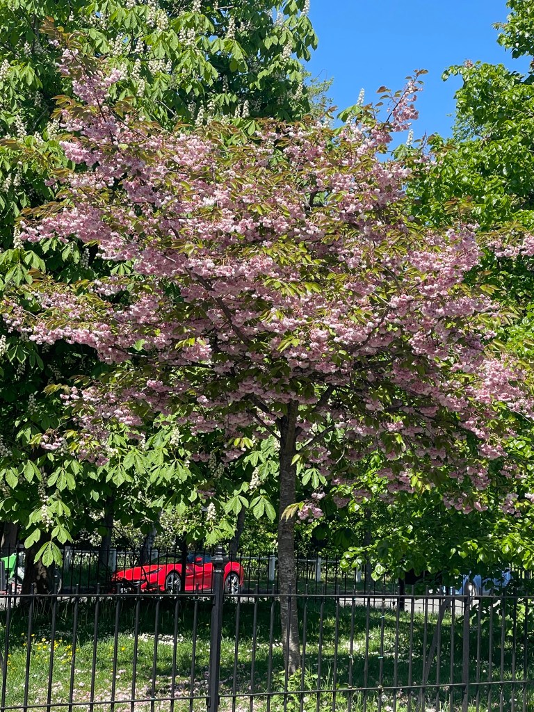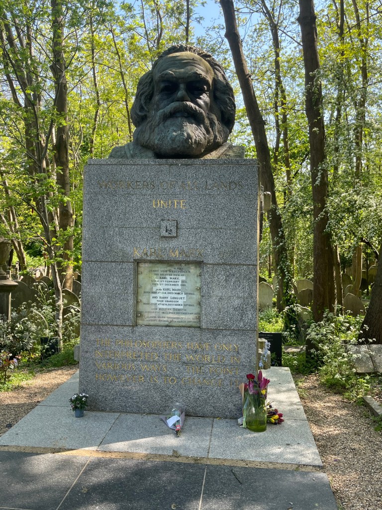 The magnificent trees busting into flower and even Cherkassky, just a stones throw away down the hill, happy to sunbathe next to Karl Marx basking hand in hand in this continental sunshine .